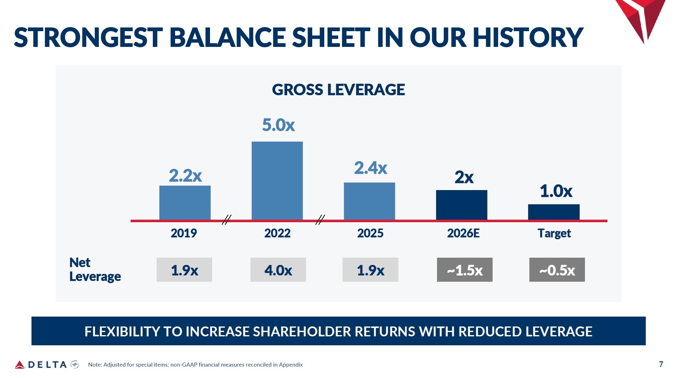 6 DURABLE EARNINGS AND CASH FLOW Note: Adjusted for special items; non - GAAP financial measures reconciled in Appendix. Industry defined as DAL, UAL, AAL, LUV, ALK, JBLU, SAVE and ULCC 2014 2025 $22B 2023 $10B High - margin premium offerings have significant runway through product mix, optimization, and loyalty PREMIUM REVENUE $19B $8.2B Best in class loyalty program and card partnership, progressing to $10B target AMEX REMUNERATION $2B $6.8B 2025 performance demonstrated Delta’s financial durability – as industry backdrop improves, Delta is positioned to win % OF INDUSTRY EARNINGS 30% 40% >55% DURABLE EARNINGS AND DISCIPLINED INVESTMENT GENERATED >$10B FCF 2023 - 2025