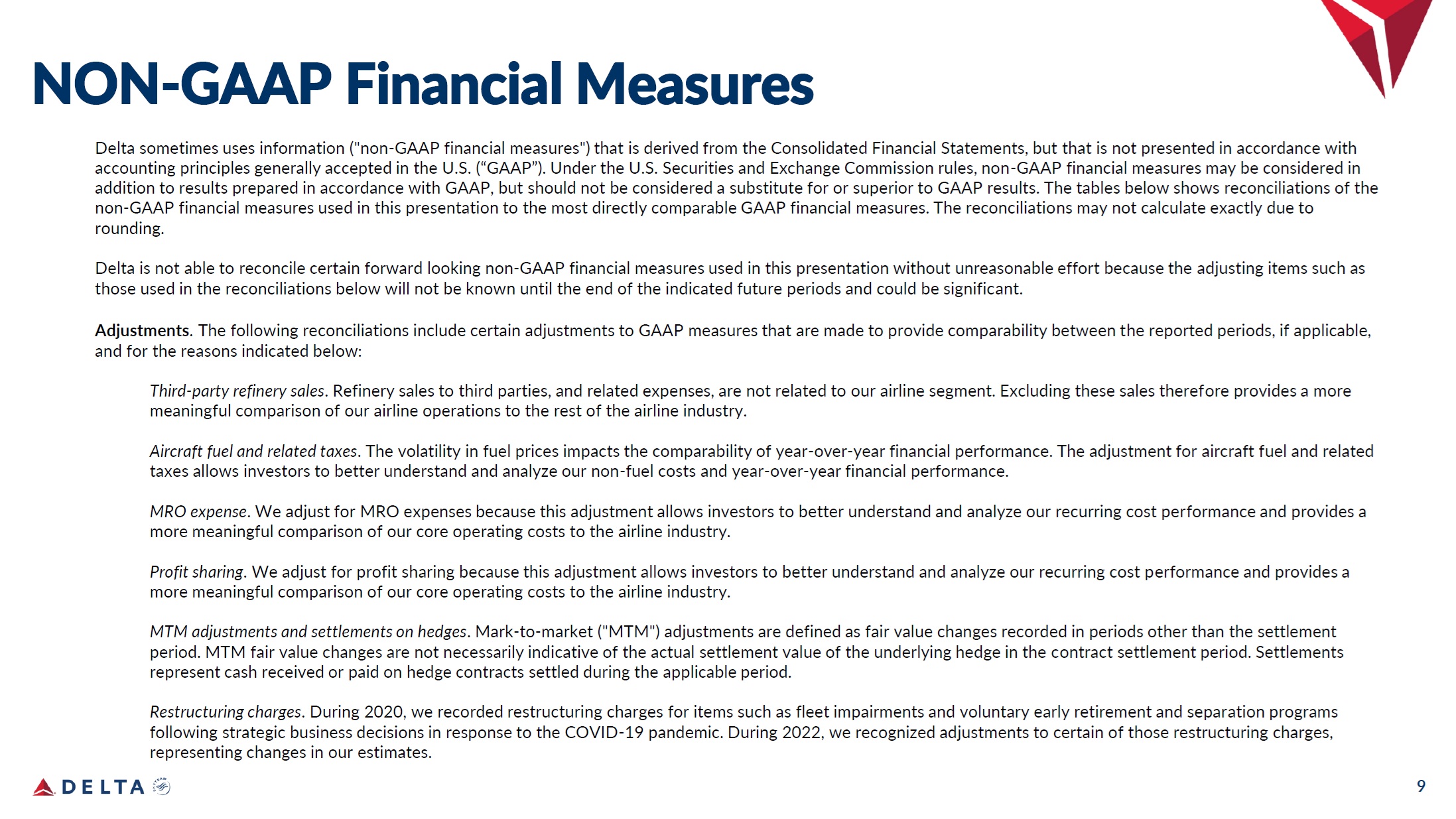 Delta sometimes uses information ("non - GAAP financial measures") that is derived from the Consolidated Financial Statements, but that is not presented in accordance with accounting principles generally accepted in the U.S. (“GAAP”). Under the U.S. Securities and Exchange Commission rules, non - GAAP financial measures may be considered in addition to results prepared in accordance with GAAP, but should not be considered a substitute for or superior to GAAP results. The tables below shows reconciliations of the non - GAAP financial measures used in this presentation to the most directly comparable GAAP financial measures. The reconciliations may not calculate exactly due to rounding. Delta is not able to reconcile certain forward looking non - GAAP financial measures used in this presentation without unreasonable effort because the adjusting items such as those used in the reconciliations below will not be known until the end of the indicated future periods and could be significant. Adjustments . The following reconciliations include certain adjustments to GAAP measures that are made to provide comparability between the reported periods, if applicable, and for the reasons indicated below: Third - party refinery sales . Refinery sales to third parties, and related expenses, are not related to our airline segment. Excluding these sales therefore provides a more meaningful comparison of our airline operations to the rest of the airline industry. Aircraft fuel and related taxes . The volatility in fuel prices impacts the comparability of year - over - year financial performance. The adjustment for aircraft fuel and related taxes allows investors to better understand and analyze our non - fuel costs and year - over - year financial performance. MRO expense . We adjust for MRO expenses because this adjustment allows investors to better understand and analyze our recurring cost performance and provides a more meaningful comparison of our core operating costs to the airline industry. Profit sharing . We adjust for profit sharing because this adjustment allows investors to better understand and analyze our recurring cost performance and provides a more meaningful comparison of our core operating costs to the airline industry. MTM adjustments and settlements on hedges . Mark - to - market ("MTM") adjustments are defined as fair value changes recorded in periods other than the settlement period. MTM fair value changes are not necessarily indicative of the actual settlement value of the underlying hedge in the contract settlement period. Settlements represent cash received or paid on hedge contracts settled during the applicable period. Restructuring charges . During 2020, we recorded restructuring charges for items such as fleet impairments and voluntary early retirement and separation programs following strategic business decisions in response to the COVID - 19 pandemic. During 2022, we recognized adjustments to certain of those restructuring charges, representing changes in our estimates. 9 NON - GAAP Financial Measures