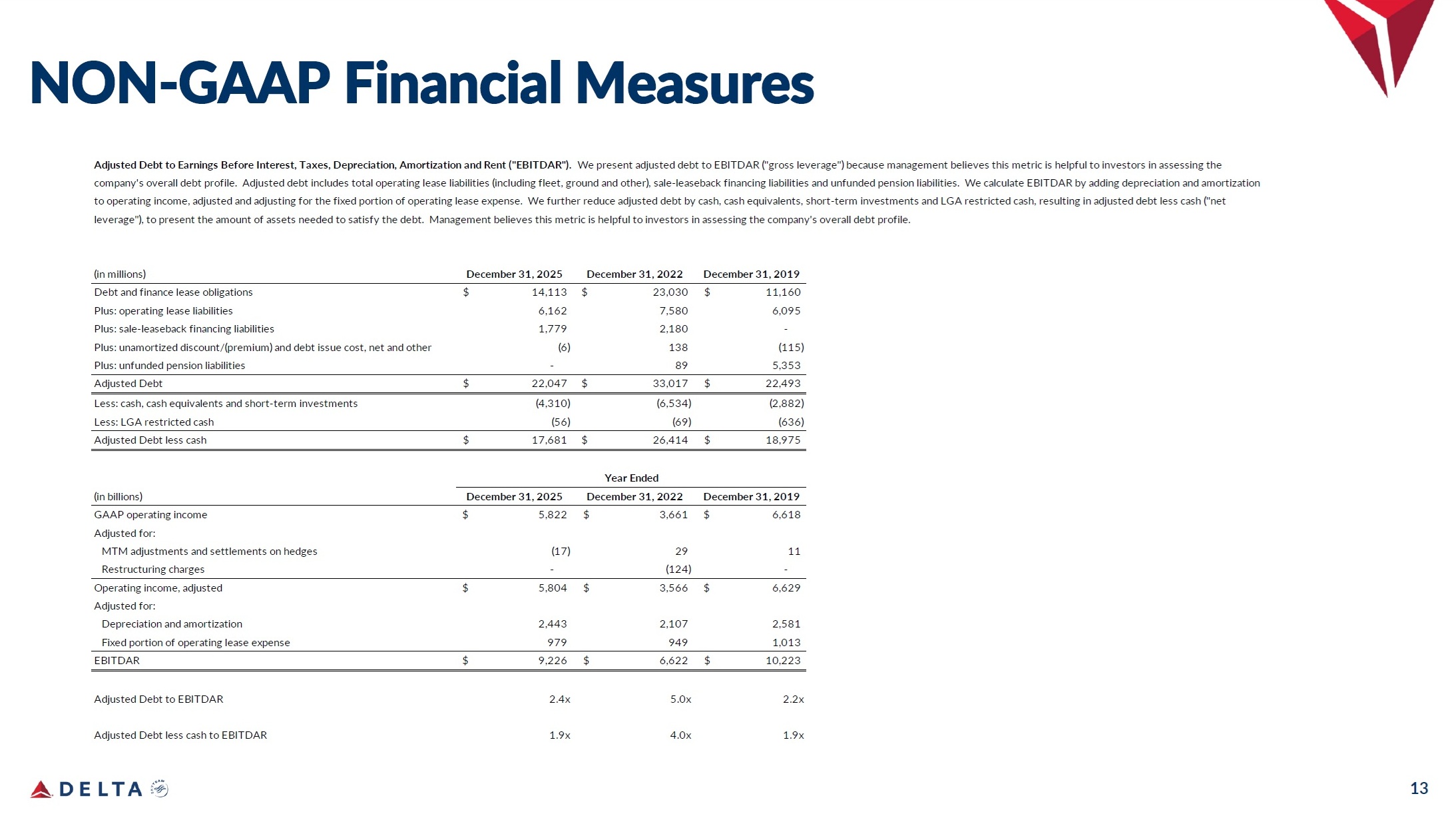 12 NON - GAAP Financial Measures Year Ended December 31, 2025 (in millions) 5,822 (17) $ Operating income Adjusted for: MTM adjustments and settlements on hedges 140 Interest expense included in aircraft rent 5,945 $ Adjusted operating income (1,404) Tax effect 4,541 $ Tax - effected adjusted operating income 18,023 $ Average stockholders' equity 19,949 Average adjusted gross debt 37,972 $ Averaged adjusted invested capital 12.0% After - tax Return on Invested Capital After - tax Return on Invested Capital ("ROIC"). We present after - tax return on invested capital as management believes this metric is helpful to investors in assessing the company's ability to generate returns using its invested capital. Return on invested capital is tax - effected adjusted operating income (using our effective tax rate for each respective period) divided by average adjusted invested capital. Average stockholders' equity and average adjusted gross debt are calculated using amounts as of the end of the current period and comparable period in the prior year. All adjustments to calculate ROIC are intended to provide a more meaningful comparison of our results to comparable companies. Interest expense included in aircraft rent. This adjustment relates to interest expense related to operating lease transactions. Adjusting for these results allows investors to better understand our core operational performance in the periods shown as it neutralizes the effect of lease financing structure.