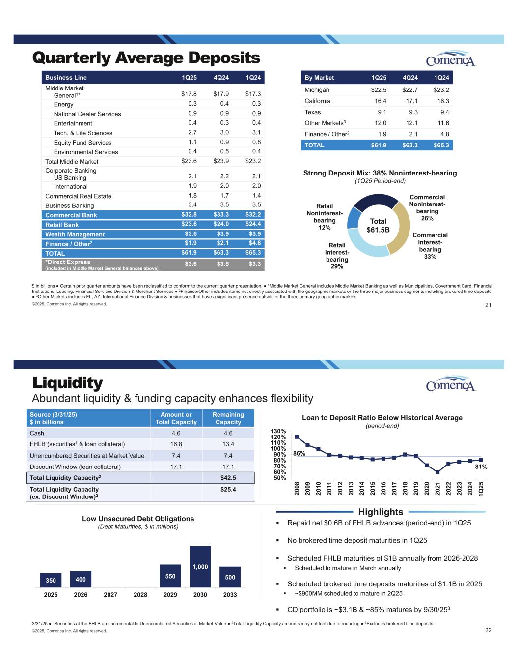 Securities Portfolio Expect future maturities to enhance earnings power 3/31/25 Totals shown in graph above may not foot due to rounding 1Outlook for legacy portfolio as of 4/21/25 assuming 3/31/25 forward curve 2Estimated as of 3/31/25 Period-end 1Q25 portfolio increased ~$60MM from 4Q24 ~$285MM MBS payments ~$335MM fair value change (pre-tax) & $10MM net discount amortization Average 1Q25 portfolio decreased $411MM 2Q25: Estimated repayments ~$260MM MBS1 Duration of 5.7 years2 Extends to 6.4 years under +200bps instantaneous rate increase2 Net securities-related AOCI unrealized loss decreased to $1.9B (after tax) ©2025, Comerica Inc. All rights reserved. 23 Securities Portfolio (period-end; $ in billions) 12.4 15.7 15.9 15.0 15.1 0.1 3.0 2.3 2.9 2.5 4Q19 2Q24 3Q24 4Q24 1Q25 Fair Value (Reported on Balance Sheet) Valuation Adjustment 1Q25 vs. 4Q24 548 533 534 575 575 2.80 2.86 2.80 3.06 3.18 1Q24 2Q24 3Q24 4Q24 1Q25 Net Interest Income 1Q25 compared to 4Q24 1See BSBY Cessation Impacts slide for more details Net Interest Income ($ in millions) 24©2025, Comerica Inc. All rights reserved. BSBY Cessation: $12MM positive impact to Net Interest Income1 & 7bps to NIM with impacts of hedging program accounted for within loan rate impact Net impact due to rates: $32MM benefit to Net Interest Income & 16bps to NIM Net Interest Margin % 4Q24 $575MM 3.06% Loans (36) (0.10) 2 less days (16) - Other portfolio dynamics (10) (0.06) Lower balances (7) (0.02) Lower short-term rates (3) (0.02) Securities Portfolio 9 0.06 Higher rates 12 0.06 Lower security balances (2) - 2 less days (1) - Fed Deposits (16) (0.04) Lower deposits with FRB (10) (0.01) Lower short-term rates (5) (0.03) 2 less days (1) - Deposits 34 0.16 Rates 20 0.11 Interest-bearing balances & mix 8 0.05 2 less days 6 - Wholesale Funding 9 0.04 Rates, incl. swaps 8 0.04 Medium & long-term debt 2 0.01 Short-term borrowings (1) (0.01) 1Q25 $575MM 3.18% 4Q24 to 1Q25 NII & NIM Walk Additional Variance Detail Relative to 4Q24 Favorable deposit trends, securities portfolio & deliberate reduction in wholesale funding offset impact of lower loans
