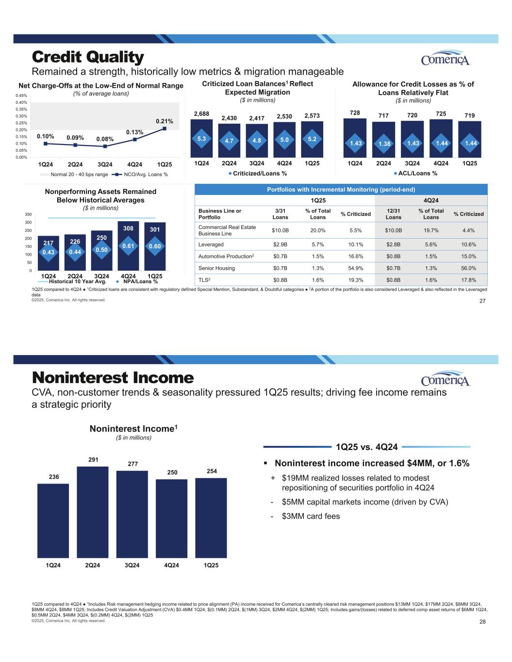 Credit Quality Remained a strength, historically low metrics & migration manageable 1Q25 compared to 4Q24 1Criticized loans are consistent with regulatory defined Special Mention, Substandard, & Doubtful categories 2A portion of the portfolio is also considered Leveraged & also reflected in the Leveraged data Nonperforming Assets Remained Below Historical Averages ($ in millions) Criticized Loan Balances1 Reflect Expected Migration ($ in millions) 728 717 720 725 719 1.43 1.38 1.43 1.44 1.44 - 1.00 2.00 3.00 4.00 5.00 6.00 1Q24 2Q24 3Q24 4Q24 1Q25 ACL/Loans % Allowance for Credit Losses as % of Loans Relatively Flat ($ in millions) 2,688 2,430 2,417 2,530 2,573 5.3 4.7 4.8 5.0 5.2 - 2.00 4.00 6.00 8.00 10.00 12.00 1Q24 2Q24 3Q24 4Q24 1Q25 Criticized/Loans % 27©2025, Comerica Inc. All rights reserved. Net Charge-Offs at the Low-End of Normal Range (% of average loans) Portfolios with Incremental Monitoring (period-end) 1Q25 4Q24 Business Line or Portfolio 3/31 Loans % of Total Loans % Criticized 12/31 Loans % of Total Loans % Criticized Commercial Real Estate Business Line $10.0B 20.0% 5.5% $10.0B 19.7% 4.4% Leveraged $2.9B 5.7% 10.1% $2.8B 5.6% 10.6% Automotive Production2 $0.7B 1.5% 16.6% $0.8B 1.5% 15.0% Senior Housing $0.7B 1.3% 54.9% $0.7B 1.3% 56.0% TLS2 $0.8B 1.6% 19.3% $0.8B 1.6% 17.8% 217 226 250 308 301 0.43 0.44 0.50 0.61 0.60 (0.10) 0.10 0.30 0.50 0.70 0.90 1.10 1.30 1.50 0 50 100 150 200 250 300 350 1Q24 2Q24 3Q24 4Q24 1Q25 Historical 10 Year Avg. NPA/Loans % 0.10% 0.09% 0.08% 0.13% 0.21% 0.00% 0.05% 0.10% 0.15% 0.20% 0.25% 0.30% 0.35% 0.40% 0.45% 1Q24 2Q24 3Q24 4Q24 1Q25 Normal 20 - 40 bps range NCO/Avg. Loans % Noninterest Income CVA, non-customer trends & seasonality pressured 1Q25 results; driving fee income remains a strategic priority 1Q25 compared to 4Q24 1Includes Risk management hedging income related to price alignment (PA) income received for Comerica’s centrally cleared risk management positions $13MM 1Q24, $17MM 2Q24, $8MM 3Q24, $8MM 4Q24, $8MM 1Q25; Includes Credit Valuation Adjustment (CVA) $0.4MM 1Q24, $(0.1MM) 2Q24, $(1MM) 3Q24, $2MM 4Q24, $(2MM) 1Q25; Includes gains/(losses) related to deferred comp asset returns of $6MM 1Q24, $0.5MM 2Q24, $4MM 3Q24, $(0.2MM) 4Q24, $(2MM) 1Q25 Noninterest Income1 ($ in millions) 236 291 277 250 254 1Q24 2Q24 3Q24 4Q24 1Q25 28©2025, Comerica Inc. All rights reserved. 1Q25 vs. 4Q24 Noninterest income increased $4MM, or 1.6% + $19MM realized losses related to modest repositioning of securities portfolio in 4Q24 - $5MM capital markets income (driven by CVA) - $3MM card fees