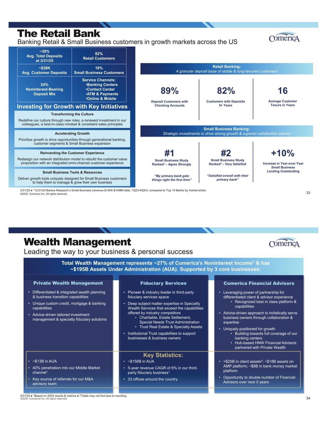 Investing for Growth with Key Initiatives Transforming the Culture Redefine our culture through new roles, a renewed investment in our colleagues, a best-in-class mindset & consistent sales principles Reinventing the Customer Experience Redesign our network distribution model to rebuild the customer value proposition with an integrated omni-channel customer experience Accelerating Growth Prioritize growth to drive opportunities through generational banking, customer segments & Small Business expansion 89% 82% 16 Average Customer Tenure in Years Deposit Customers with Checking Accounts ©2025, Comerica Inc. All rights reserved. The Retail Bank Banking Retail & Small Business customers in growth markets across the US 3/31/25 112/31/24 Barlow Research’s Small Business (revenue $100K-$10MM data: 1Q23-4Q24): compared to Top 10 Banks by market share. Retail Banking: A granular deposit base of stable & long-tenured customers Small Business Banking: Customers with Deposits 5+ Years ~38% at 3/31/25 ~$28K Avg. Customer Deposits Small Business Customers 24% Noninterest-Bearing Deposit Mix Service Channels: •Banking Centers •Contact Center •ATM & Payments •Online & Mobile #1 #2 +10% Increase in Year-over-Year Small Business Lending Outstanding Small Business Study Ranked1 – Very Satisfied “Satisfied overall with their primary bank” Small Business Tools & Resources Deliver growth tools uniquely designed for Small Business customers to help them to manage & grow their own business Small Business Study Ranked1 – Agree Strongly “My primary bank gets things right the first time” 33 ©2025, Comerica Inc. All rights reserved. Wealth Management Leading the way to your business & personal success Fiduciary Services • Pioneer & industry leader in third-party fiduciary services space • Deep subject matter expertise in Specialty Wealth Services that exceed the capabilities offered by industry competitors • Charitable, Estate Settlement, Special Needs Trust Administration • Trust Real Estate & Specialty Assets • Institutional Trust capabilities to support businesses & business owners • ~$156B in AUA • 5-year revenue CAGR of 6% in our third- party fiduciary business1 • 33 offices around the country Private Wealth Management • Differentiated & integrated wealth planning & business transition capabilities • Unique custom credit, mortgage & banking capabilities • Advice-driven tailored investment management & specialty fiduciary solutions • ~$13B in AUA • 40% penetration into our Middle Market channel1 • Key source of referrals for our M&A advisory team Comerica Financial Advisors • Leveraging power of partnership for differentiated client & advisor experience • Recognized best in class platform & capabilities • Advice-driven approach to holistically serve business owners through collaboration & expertise • Uniquely positioned for growth • Building towards full coverage of our banking centers • Hub-based HNW Financial Advisors partnered with Private Wealth • >$25B in client assets2: ~$18B assets on AMP platform; ~$8B in bank money market platform • Opportunity to double number of Financial Advisors over next 5 years 34 Total Wealth Management represents ~27% of Comerica’s Noninterest Income1 & has ~$195B Assets Under Administration (AUA). Supported by 3 core businesses: 3/31/25 1Based on 2024 results & metrics 2Totals may not foot due to rounding Key Statistics: