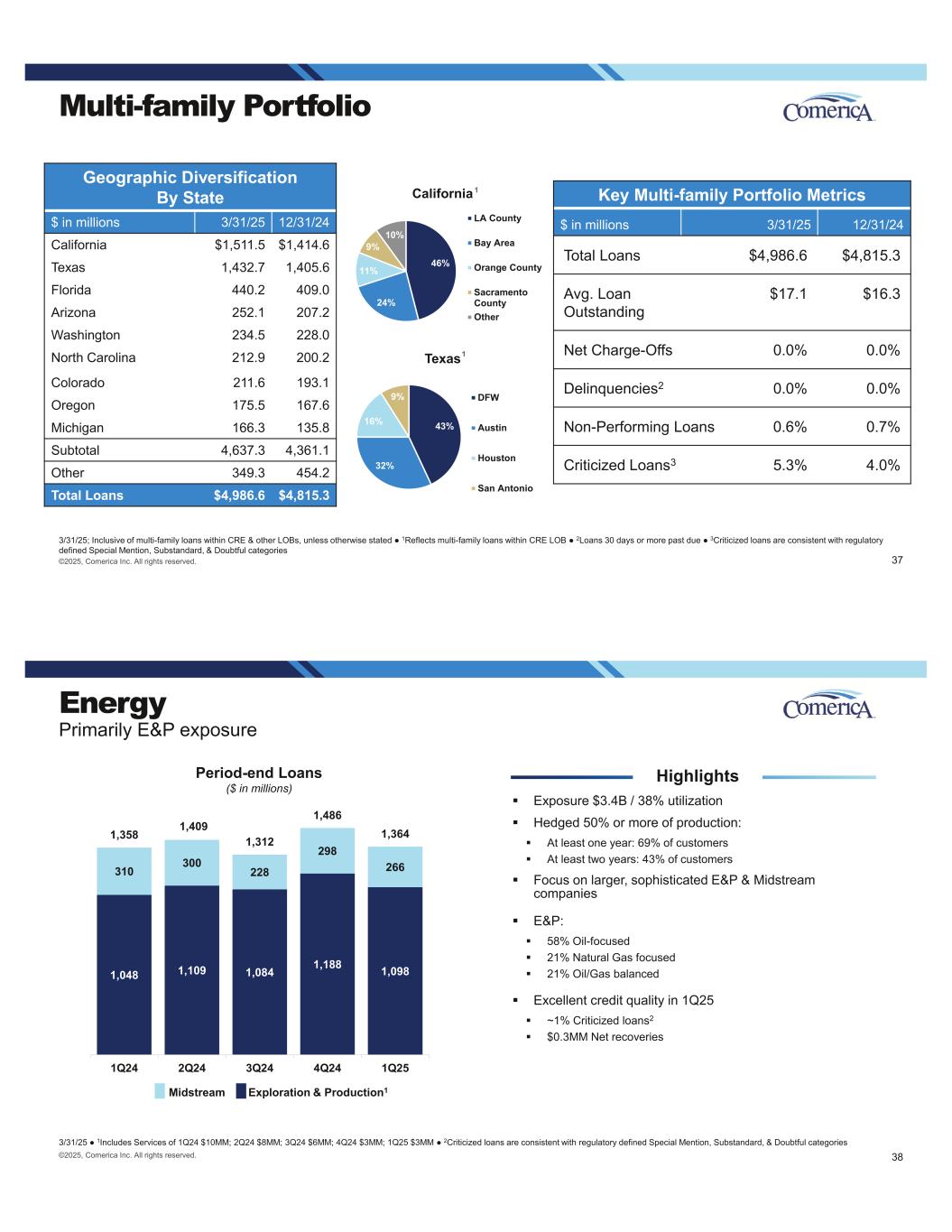 3/31/25 1Excludes CRE business line loans not secured by real estate 2Criticized loans are consistent with regulatory defined Special Mention, Substandard, & Doubtful categories 3Calculated as of 12/31/24 Not primary strategy: Total CMA office loans of $682MM, or <1% of total loans; outstandings within CRE LOB of $406MM, or <1% of total CMA loans Selective geography: Urban in-fill & suburban strategy Majority recourse: Strong sponsors critical to underwriting Monitoring credit: Criticized loans totaling $88MM (or 13% of total office portfolio) Multi-family 50% Industrial 28% All Other 22% Commercial Real Estate Business Line Growth driven by multi-family & industrial projects; excellent credit quality Primarily Lower Risk Multi-family & Industrial1 (1Q25 period-end) Total $9.4B Long history of working with well-established, proven developers Experienced relationship team; average tenure: CRE line of business leadership: ~28 years Relationship managers: ~19 years CRE credit approval team: ~25 years Significant up-front equity required (typically averaging 35-40%, often from institutional investors) ~70% has recourse3 Majority of commitments originate as construction Primary strategy is financing development of Class A, urban infill multi- family & warehouse distribution in major sun belt metros (30% CA, 28% TX, 12% Southeast, 11% Southwest) Credit remains manageable ~72% of the portfolio maturing by the end of 2026 ©2025, Comerica Inc. All rights reserved. 35 Excellent Credit Quality in Commercial Real Estate Business ($ in millions) 1Q24 2Q24 3Q24 4Q24 1Q25 NAL 18 18 18 49 66 Criticized2 443 448 476 442 546 % Criticized 4.3% 4.3% 4.5% 4.4% 5.5% NCO (Recoveries) (0.01) (0.26) (1.48) (0.30) 10.82 Strong Credit Profile Driven by: Total CMA Office Exposure All Other: Retail, 5% Self-Storage, 5% Office, 4% Land Carry, 3% Single Family / Land Development, 2% Multi-use, 2% Other, 1% ©2025, Comerica Inc. All rights reserved. Total Office Portfolio Not a primary strategy Geographic Diversification By State $ in millions 3/31/25 12/31/24 California $277.9 $277.7 Texas 200.8 201.2 Michigan 60.5 60.8 Washington 40.1 40.1 Arizona 20.3 20.5 Nevada 11.8 11.8 Georgia 4.7 4.7 Illinois 4.4 4.4 Florida 1.5 1.5 Subtotal 622.0 622.7 Other1 59.5 58.5 Total Loans $681.5 $681.2 Key Office Portfolio Metrics $ in millions 3/31/25 12/31/24 Total Loans $681.5 $681.2 Avg. Loan Outstanding $4.9 $4.7 Net Charge-Offs 2.0% 0.0% Delinquencies2 1.8% 0.2% Non-Performing Loans 2.8% 4.7% Criticized Loans3 13.0% 19.6% 3/31/25 1Other includes loans to funds secured by multiple properties 2Loans 30 days or more past due 3Criticized loans are consistent with regulatory defined Special Mention, Substandard, & Doubtful categories 36