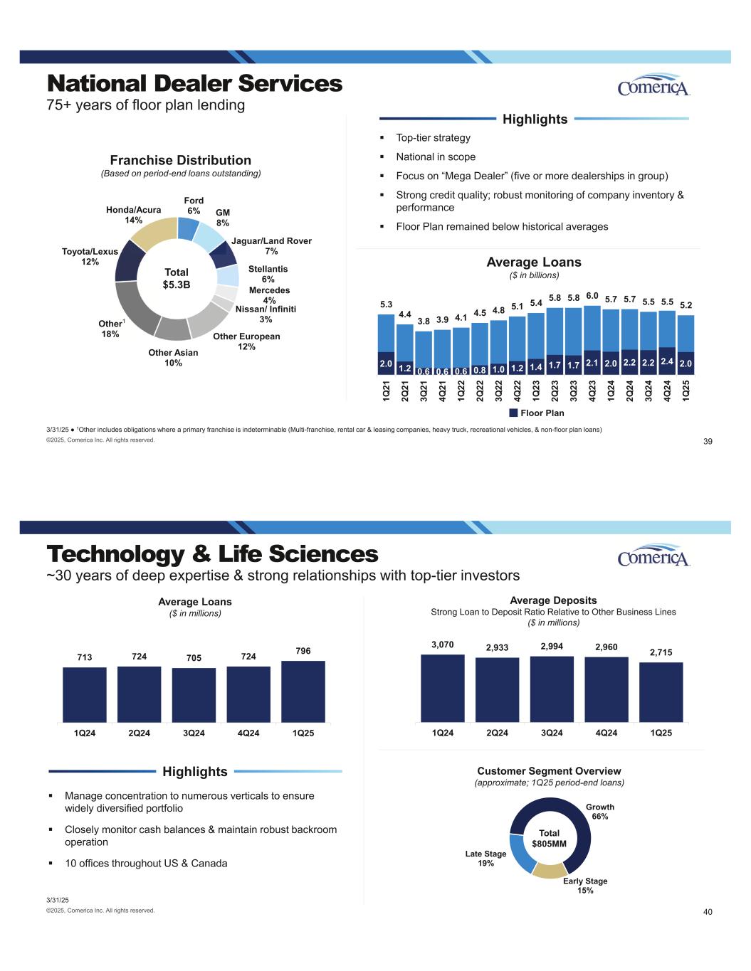 National Dealer Services 75+ years of floor plan lending 3/31/25 1Other includes obligations where a primary franchise is indeterminable (Multi-franchise, rental car & leasing companies, heavy truck, recreational vehicles, & non-floor plan loans) Franchise Distribution (Based on period-end loans outstanding) Top-tier strategy National in scope Focus on “Mega Dealer” (five or more dealerships in group) Strong credit quality; robust monitoring of company inventory & performance Floor Plan remained below historical averages 2.0 1.2 0.6 0.6 0.6 0.8 1.0 1.2 1.4 1.7 1.7 2.1 2.0 2.2 2.2 2.4 2.0 5.3 4.4 3.8 3.9 4.1 4.5 4.8 5.1 5.4 5.8 5.8 6.0 5.7 5.7 5.5 5.5 5.2 1Q 21 2Q 21 3Q 21 4Q 21 1Q 22 2Q 22 3Q 22 4Q 22 1Q 23 2Q 23 3Q 23 4Q 23 1Q 24 2Q 24 3Q 24 4Q 24 1Q 25 Floor Plan Average Loans ($ in billions) ©2025, Comerica Inc. All rights reserved. 39 Highlights Toyota/Lexus 12% Honda/Acura 14% Ford 6% GM 8% Jaguar/Land Rover 7% Stellantis 6% Mercedes 4% Nissan/ Infiniti 3% Other European 12%Other Asian 10% Other 18% Total $5.3B 1 3,070 2,933 2,994 2,960 2,715 0 500 1,000 1,500 2,000 2,500 3,000 3,500 1Q24 2Q24 3Q24 4Q24 1Q25 713 724 705 724 796 1Q24 2Q24 3Q24 4Q24 1Q25 Technology & Life Sciences ~30 years of deep expertise & strong relationships with top-tier investors 3/31/25 Average Loans ($ in millions) Manage concentration to numerous verticals to ensure widely diversified portfolio Closely monitor cash balances & maintain robust backroom operation 10 offices throughout US & Canada Average Deposits Strong Loan to Deposit Ratio Relative to Other Business Lines ($ in millions) Growth 66% Early Stage 15% Late Stage 19% Customer Segment Overview (approximate; 1Q25 period-end loans) Total $805MM ©2025, Comerica Inc. All rights reserved. 40 Highlights