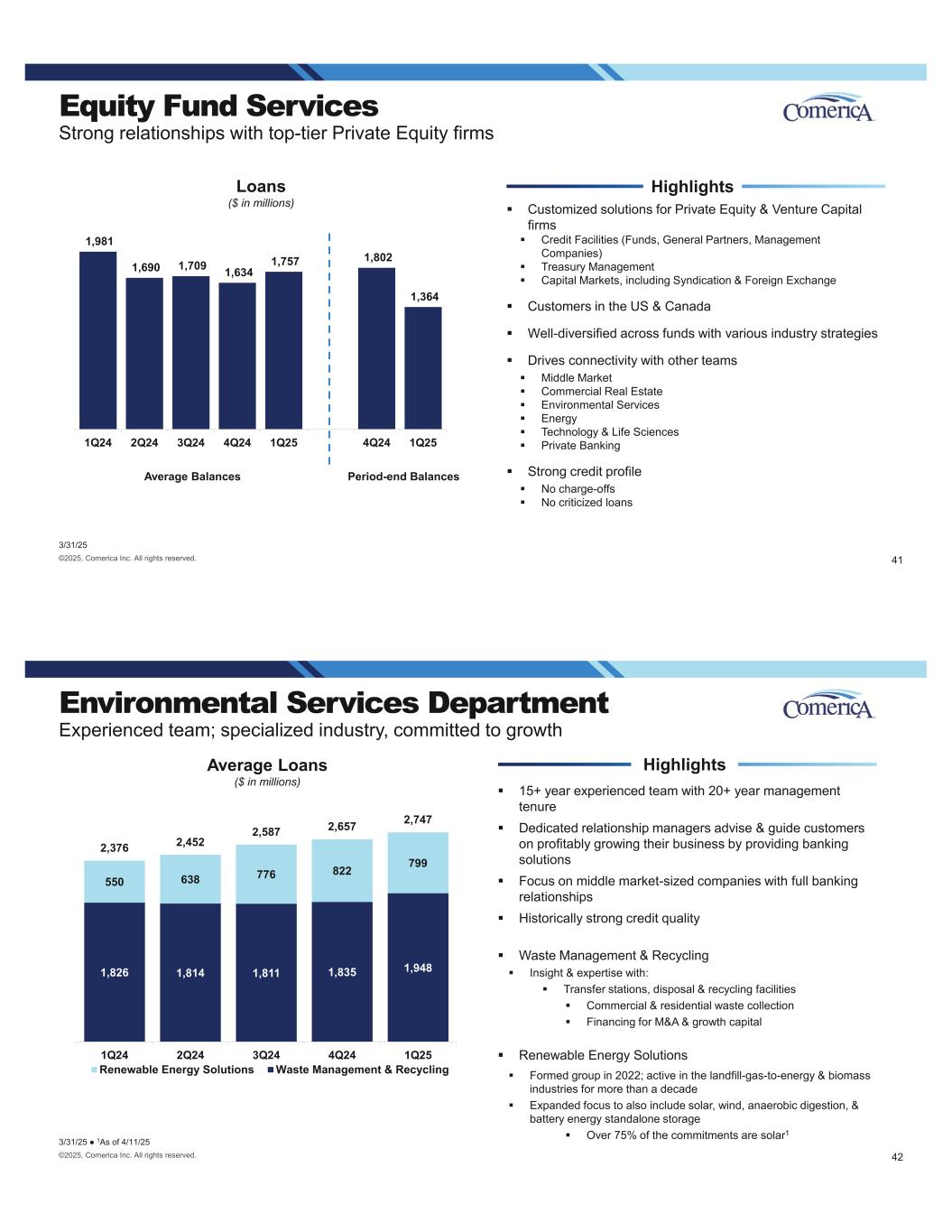 Equity Fund Services Strong relationships with top-tier Private Equity firms 3/31/25 Customized solutions for Private Equity & Venture Capital firms Credit Facilities (Funds, General Partners, Management Companies) Treasury Management Capital Markets, including Syndication & Foreign Exchange Customers in the US & Canada Well-diversified across funds with various industry strategies Drives connectivity with other teams Middle Market Commercial Real Estate Environmental Services Energy Technology & Life Sciences Private Banking Strong credit profile No charge-offs No criticized loans ©2025, Comerica Inc. All rights reserved. 41 Loans ($ in millions) 1,981 1,690 1,709 1,634 1,757 1,802 1,364 1Q24 2Q24 3Q24 4Q24 1Q25 4Q24 1Q25 Average Balances Period-end Balances Highlights Environmental Services Department Experienced team; specialized industry, committed to growth 3/31/25 1As of 4/11/25 15+ year experienced team with 20+ year management tenure Dedicated relationship managers advise & guide customers on profitably growing their business by providing banking solutions Focus on middle market-sized companies with full banking relationships Historically strong credit quality Waste Management & Recycling Insight & expertise with: Transfer stations, disposal & recycling facilities Commercial & residential waste collection Financing for M&A & growth capital Renewable Energy Solutions Formed group in 2022; active in the landfill-gas-to-energy & biomass industries for more than a decade Expanded focus to also include solar, wind, anaerobic digestion, & battery energy standalone storage Over 75% of the commitments are solar1 1,826 1,814 1,811 1,835 1,948 550 638 776 822 799 2,376 2,452 2,587 2,657 2,747 1Q24 2Q24 3Q24 4Q24 1Q25 Renewable Energy Solutions Waste Management & Recycling Average Loans ($ in millions) ©2025, Comerica Inc. All rights reserved. 42 Highlights