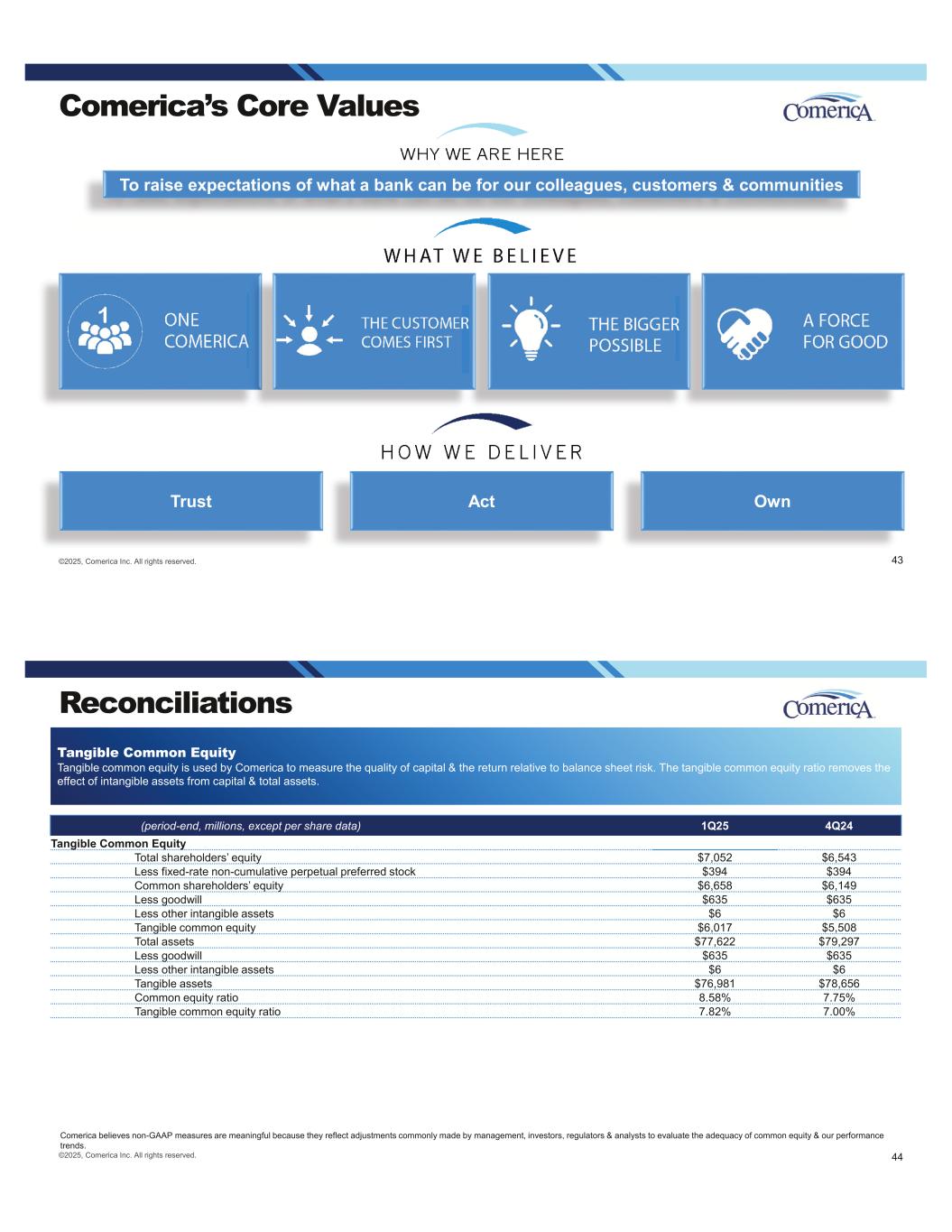 ©2025, Comerica Inc. All rights reserved. Comerica’s Core Values Trust OwnAct To raise expectations of what a bank can be for our colleagues, customers & communities 43 Reconciliations ©2025, Comerica Inc. All rights reserved. 44 (period-end, millions, except per share data) 1Q25 4Q24 Tangible Common Equity Total shareholders’ equity $7,052 $6,543 Less fixed-rate non-cumulative perpetual preferred stock $394 $394 Common shareholders’ equity $6,658 $6,149 Less goodwill $635 $635 Less other intangible assets $6 $6 Tangible common equity $6,017 $5,508 Total assets $77,622 $79,297 Less goodwill $635 $635 Less other intangible assets $6 $6 Tangible assets $76,981 $78,656 Common equity ratio 8.58% 7.75% Tangible common equity ratio 7.82% 7.00% Tangible Common Equity Tangible common equity is used by Comerica to measure the quality of capital & the return relative to balance sheet risk. The tangible common equity ratio removes the effect of intangible assets from capital & total assets. Comerica believes non-GAAP measures are meaningful because they reflect adjustments commonly made by management, investors, regulators & analysts to evaluate the adequacy of common equity & our performance trends.