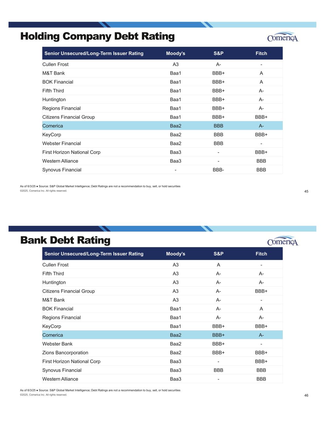 Holding Company Debt Rating As of 6/3/25 Source: S&P Global Market Intelligence; Debt Ratings are not a recommendation to buy, sell, or hold securities Senior Unsecured/Long-Term Issuer Rating Moody’s S&P Fitch Cullen Frost A3 A- - M&T Bank Baa1 BBB+ A BOK Financial Baa1 BBB+ A Fifth Third Baa1 BBB+ A- Huntington Baa1 BBB+ A- Regions Financial Baa1 BBB+ A- Citizens Financial Group Baa1 BBB+ BBB+ Comerica Baa2 BBB A- KeyCorp Baa2 BBB BBB+ Webster Financial Baa2 BBB - First Horizon National Corp Baa3 - BBB+ Western Alliance Baa3 - BBB Synovus Financial - BBB- BBB ©2025, Comerica Inc. All rights reserved. 45 Bank Debt Rating As of 6/3/25 Source: S&P Global Market Intelligence; Debt Ratings are not a recommendation to buy, sell, or hold securities Senior Unsecured/Long-Term Issuer Rating Moody’s S&P Fitch Cullen Frost A3 A - Fifth Third A3 A- A- Huntington A3 A- A- Citizens Financial Group A3 A- BBB+ M&T Bank A3 A- - BOK Financial Baa1 A- A Regions Financial Baa1 A- A- KeyCorp Baa1 BBB+ BBB+ Comerica Baa2 BBB+ A- Webster Bank Baa2 BBB+ - Zions Bancorporation Baa2 BBB+ BBB+ First Horizon National Corp Baa3 - BBB+ Synovus Financial Baa3 BBB BBB Western Alliance Baa3 - BBB ©2025, Comerica Inc. All rights reserved. 46