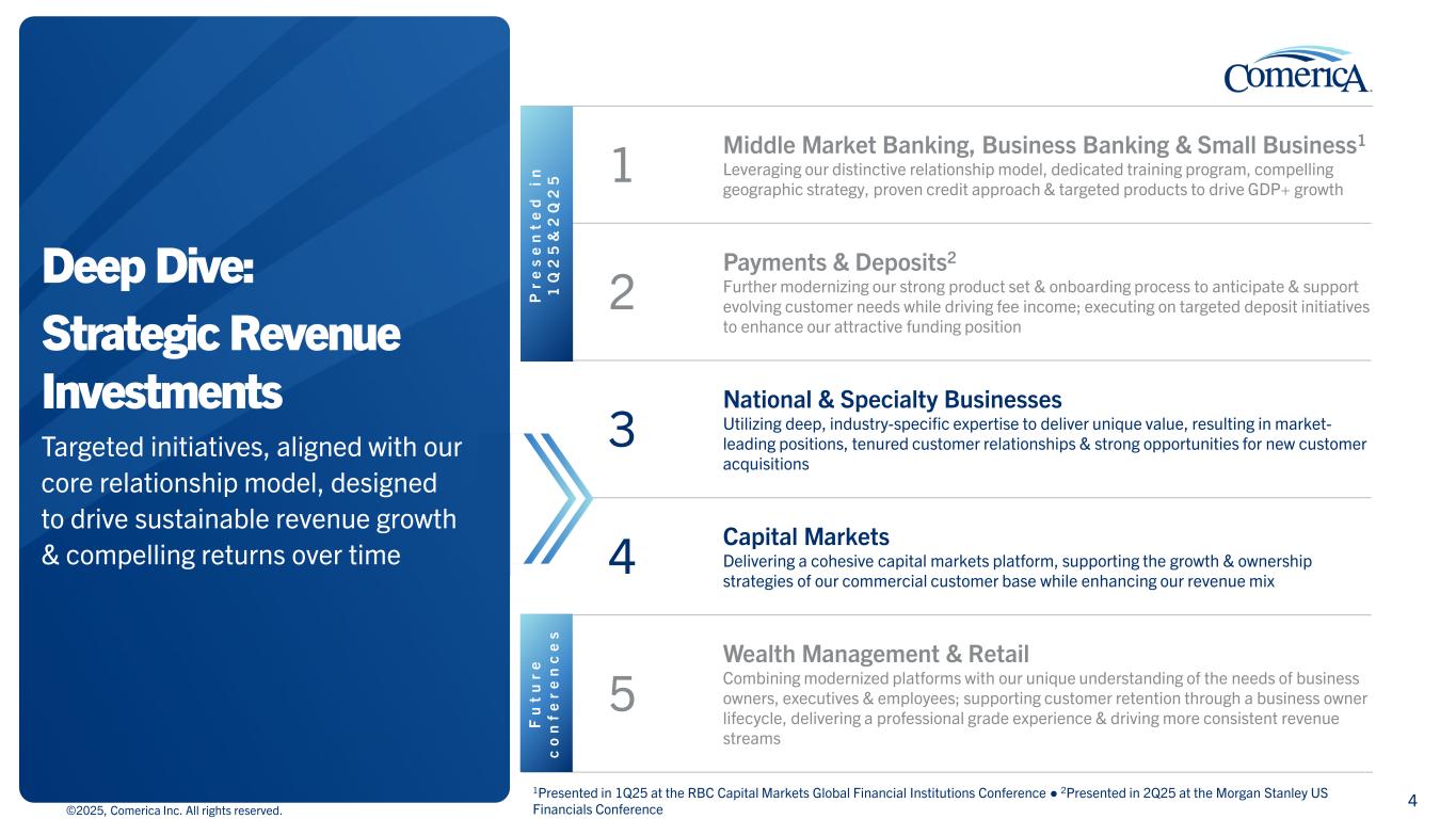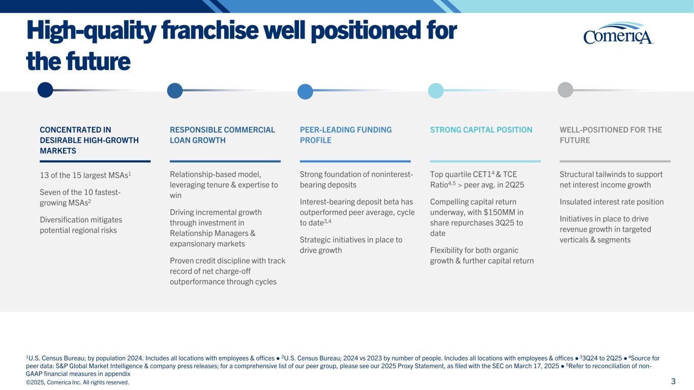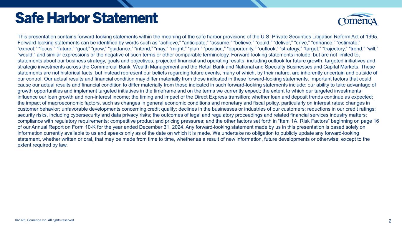 This presentation contains forward-looking statements within the meaning of the safe harbor provisions of the U.S. Private Securities Litigation Reform Act of 1995. Forward-looking statements can be identified by words such as “achieve,” “anticipate,” “assume,” “believe,” “could,” “deliver,” “drive,” “enhance,” “estimate,” “expect,” “focus,” “future,” “goal,” “grow,” “guidance,” “intend,” “may,” “might,” “plan,” “position,” “opportunity,” “outlook,” “strategy,” “target,” “trajectory,” “trend,” “will,” “would,” and similar expressions or the negative of such terms or other comparable terminology. Forward-looking statements include, but are not limited to, statements about our business strategy, goals and objectives, projected financial and operating results, including outlook for future growth, targeted initiatives and strategic investments across the Commercial Bank, Wealth Management and the Retail Bank and National and Specialty Businesses and Capital Markets. These statements are not historical facts, but instead represent our beliefs regarding future events, many of which, by their nature, are inherently uncertain and outside of our control. Our actual results and financial condition may differ materially from those indicated in these forward-looking statements. Important factors that could cause our actual results and financial condition to differ materially from those indicated in such forward-looking statements include: our ability to take advantage of growth opportunities and implement targeted initiatives in the timeframe and on the terms we currently expect; the extent to which our targeted investments influence our loan growth and non-interest income; the timing and impact of the Direct Express transition; whether loan and deposit trends continue as expected; the impact of macroeconomic factors, such as changes in general economic conditions and monetary and fiscal policy, particularly on interest rates; changes in customer behavior; unfavorable developments concerning credit quality; declines in the businesses or industries of our customers; reductions in our credit ratings; security risks, including cybersecurity and data privacy risks; the outcomes of legal and regulatory proceedings and related financial services industry matters; compliance with regulatory requirements; competitive product and pricing pressures; and the other factors set forth in “Item 1A. Risk Factors” beginning on page 16 of our Annual Report on Form 10-K for the year ended December 31, 2024. Any forward-looking statement made by us in this presentation is based solely on information currently available to us and speaks only as of the date on which it is made. We undertake no obligation to publicly update any forward-looking statement, whether written or oral, that may be made from time to time, whether as a result of new information, future developments or otherwise, except to the extent required by law. Safe Harbor Statement 2©2025, Comerica Inc. All rights reserved.