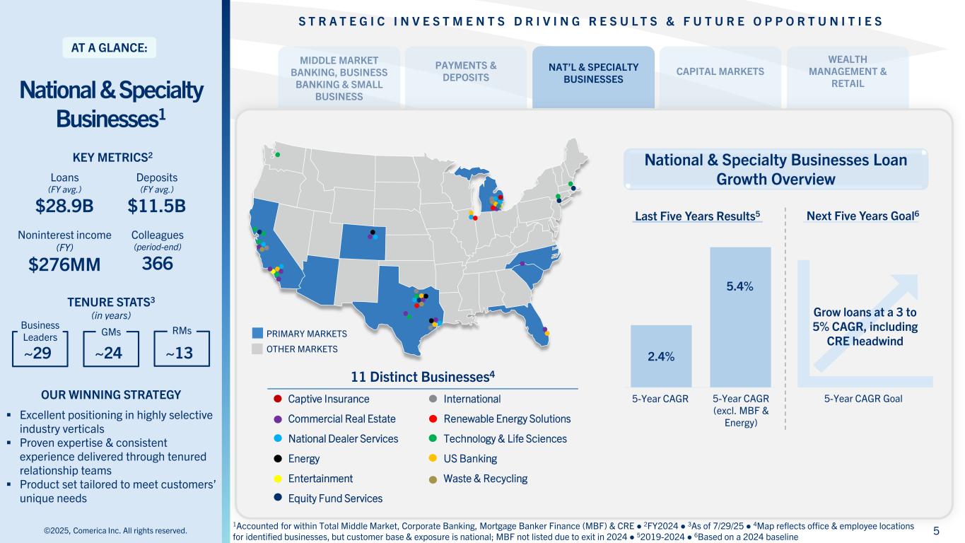 S T R A T E G I C I N V E S T M E N T S D R I V I N G R E S U L T S & F U T U R E O P P O R T U N I T I E S National & Specialty Businesses1 AT A GLANCE: NAT’L & SPECIALTY BUSINESSES TENURE STATS3 (in years) KEY METRICS2 Noninterest income (FY) $276MM Colleagues (period-end) 366 Loans (FY avg.) $28.9B Deposits (FY avg.) $11.5B ©2025, Comerica Inc. All rights reserved. 1Accounted for within Total Middle Market, Corporate Banking, Mortgage Banker Finance (MBF) & CRE ● 2FY2024 ● 3As of 7/29/25 ● 4Map reflects office & employee locations for identified businesses, but customer base & exposure is national; MBF not listed due to exit in 2024 ● 52019-2024 ● 6Based on a 2024 baseline Business Leaders GMs RMs ~29 ~13~24 11 Distinct Businesses4 Captive Insurance International Commercial Real Estate Renewable Energy Solutions National Dealer Services Technology & Life Sciences Energy US Banking Entertainment Waste & Recycling Equity Fund Services OUR WINNING STRATEGY Excellent positioning in highly selective industry verticals Proven expertise & consistent experience delivered through tenured relationship teams Product set tailored to meet customers’ unique needs National & Specialty Businesses Loan Growth Overview Next Five Years Goal6Last Five Years Results5 PRIMARY MARKETS OTHER MARKETS 5-Year CAGR 5-Year CAGR (excl. MBF & Energy) 2.4% 5.4% Grow loans at a 3 to 5% CAGR, including CRE headwind 5-Year CAGR Goal 5