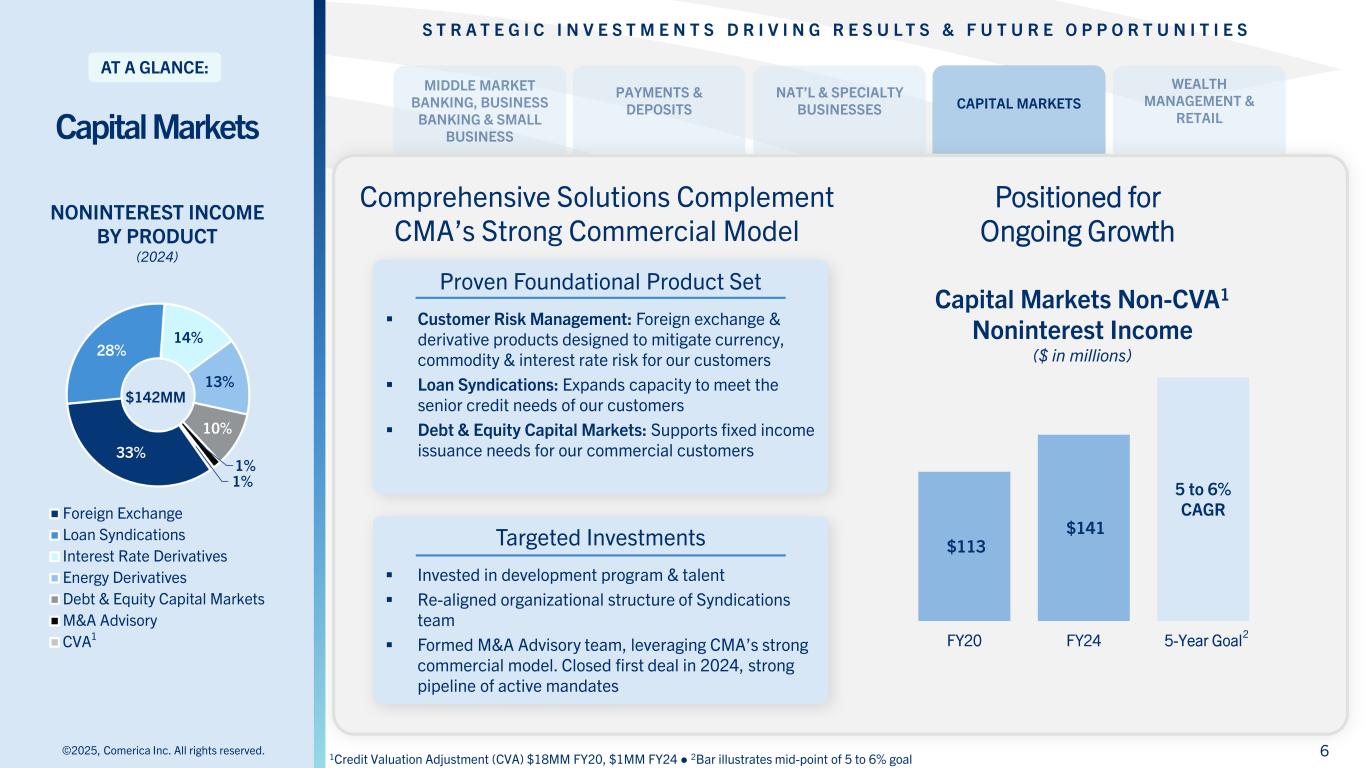 S T R A T E G I C I N V E S T M E N T S D R I V I N G R E S U L T S & F U T U R E O P P O R T U N I T I E S CAPITAL MARKETS ©2025, Comerica Inc. All rights reserved. 33% 28% 14% 13% 10% 1% 1% Foreign Exchange Loan Syndications Interest Rate Derivatives Energy Derivatives Debt & Equity Capital Markets M&A Advisory CVA NONINTEREST INCOME BY PRODUCT (2024) $142MM Capital Markets Non-CVA1 Noninterest Income ($ in millions) Targeted Investments Invested in development program & talent Re-aligned organizational structure of Syndications team Formed M&A Advisory team, leveraging CMA’s strong commercial model. Closed first deal in 2024, strong pipeline of active mandates Proven Foundational Product Set Customer Risk Management: Foreign exchange & derivative products designed to mitigate currency, commodity & interest rate risk for our customers Loan Syndications: Expands capacity to meet the senior credit needs of our customers Debt & Equity Capital Markets: Supports fixed income issuance needs for our commercial customers $113 $141 5 to 6% CAGR FY20 FY24 5-Year Goal Positioned for Ongoing Growth Comprehensive Solutions Complement CMA’s Strong Commercial Model 6 AT A GLANCE: Capital Markets 1Credit Valuation Adjustment (CVA) $18MM FY20, $1MM FY24 ● 2Bar illustrates mid-point of 5 to 6% goal 1 2