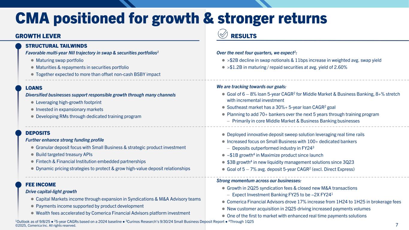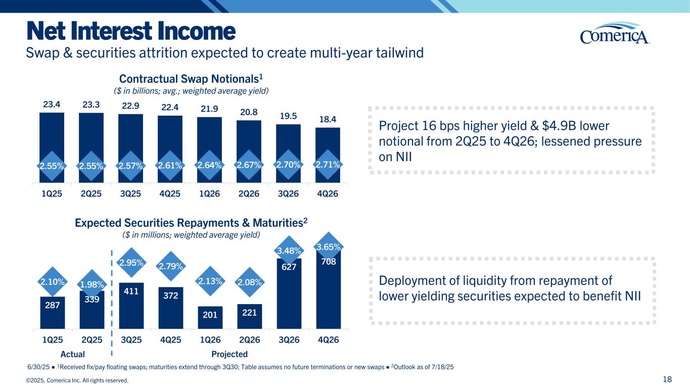 ©2025, Comerica Inc. All rights reserved. Net Interest Income Expected Securities Repayments & Maturities2 ($ in millions; weighted average yield) 287 339 411 372 201 221 627 708 2.10% 1.98% 2.95% 2.79% 2.13% 2.08% 3.48% 3.65% 1Q25 2Q25 3Q25 4Q25 1Q26 2Q26 3Q26 4Q26 Contractual Swap Notionals1 ($ in billions; avg.; weighted average yield) Swap & securities attrition expected to create multi-year tailwind Project 16 bps higher yield & $4.9B lower notional from 2Q25 to 4Q26; lessened pressure on NII Deployment of liquidity from repayment of lower yielding securities expected to benefit NII 6/30/25 ● 1Received fix/pay floating swaps; maturities extend through 3Q30; Table assumes no future terminations or new swaps ● 2Outlook as of 7/18/25 23.4 23.3 22.9 22.4 21.9 20.8 19.5 18.4 2.55% 2.55% 2.57% 2.61% 2.64% 2.67% 2.70% 2.71% 1Q25 2Q25 3Q25 4Q25 1Q26 2Q26 3Q26 4Q26 Actual Projected 18