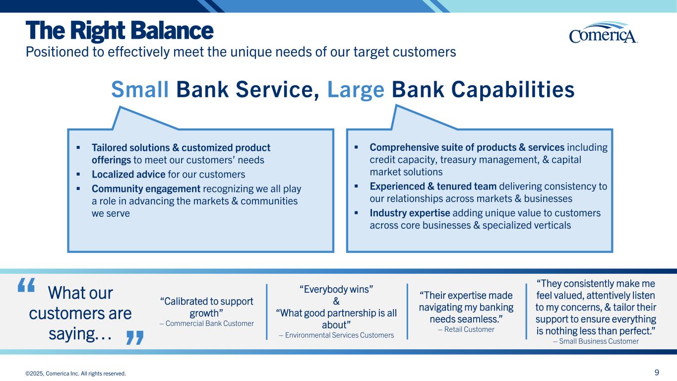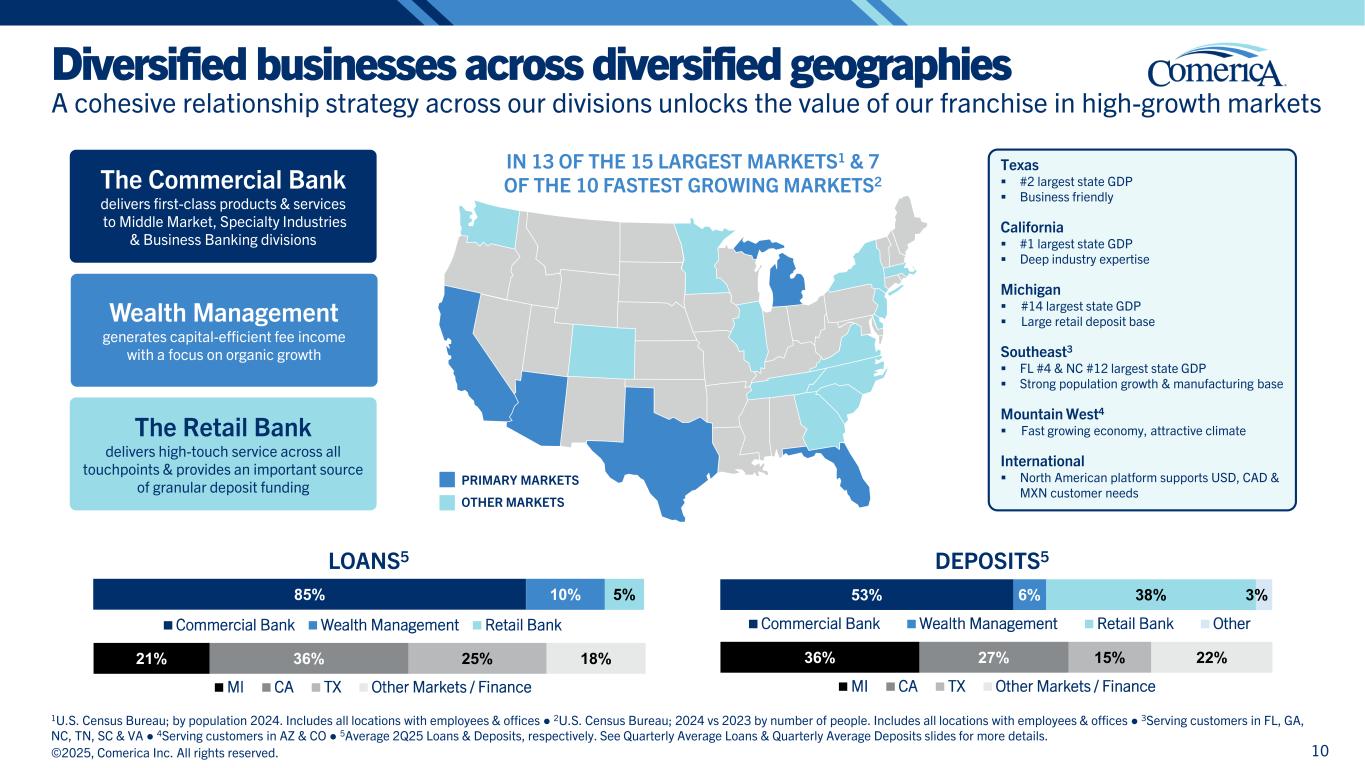 The Right Balance Positioned to effectively meet the unique needs of our target customers “Calibrated to support growth” – Commercial Bank Customer “Everybody wins” & “What good partnership is all about” – Environmental Services Customers Small Bank Service, Large Bank Capabilities Tailored solutions & customized product offerings to meet our customers’ needs Localized advice for our customers Community engagement recognizing we all play a role in advancing the markets & communities we serve Comprehensive suite of products & services including credit capacity, treasury management, & capital market solutions Experienced & tenured team delivering consistency to our relationships across markets & businesses Industry expertise adding unique value to customers across core businesses & specialized verticals 9©2025, Comerica Inc. All rights reserved. What our customers are saying… “ “ “They consistently make me feel valued, attentively listen to my concerns, & tailor their support to ensure everything is nothing less than perfect.” – Small Business Customer “Their expertise made navigating my banking needs seamless.” – Retail Customer