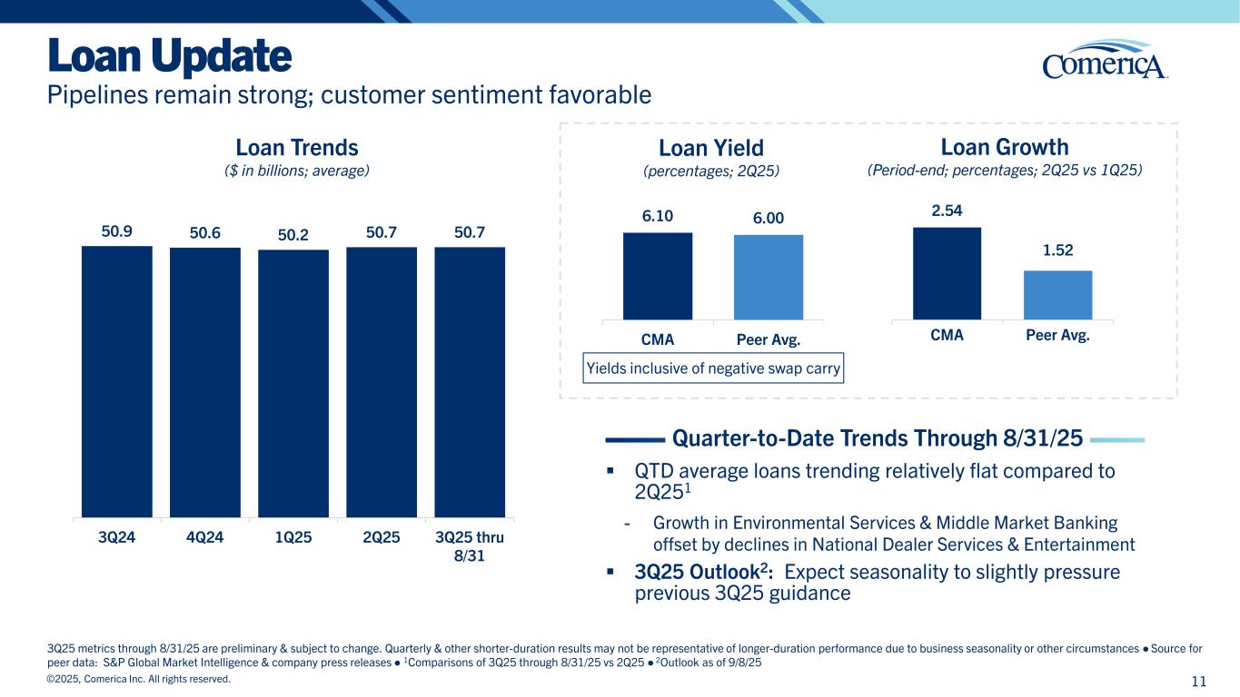 The Commercial Bank delivers first-class products & services to Middle Market, Specialty Industries & Business Banking divisions Wealth Management generates capital-efficient fee income with a focus on organic growth The Retail Bank delivers high-touch service across all touchpoints & provides an important source of granular deposit funding IN 13 OF THE 15 LARGEST MARKETS1 & 7 OF THE 10 FASTEST GROWING MARKETS2 DEPOSITS5LOANS5 ©2025, Comerica Inc. All rights reserved. 85% 10% 5% Commercial Bank Wealth Management Retail Bank 53% 6% 38% 3% Commercial Bank Wealth Management Retail Bank Other 36% 27% 15% 22% MI CA TX Other Markets / Finance 21% 36% 25% 18% MI CA TX Other Markets / Finance PRIMARY MARKETS OTHER MARKETS Texas #2 largest state GDP Business friendly California #1 largest state GDP Deep industry expertise Michigan #14 largest state GDP Large retail deposit base Southeast3 FL #4 & NC #12 largest state GDP Strong population growth & manufacturing base Mountain West4 Fast growing economy, attractive climate International North American platform supports USD, CAD & MXN customer needs 1U.S. Census Bureau; by population 2024. Includes all locations with employees & offices ● 2U.S. Census Bureau; 2024 vs 2023 by number of people. Includes all locations with employees & offices ● 3Serving customers in FL, GA, NC, TN, SC & VA ● 4Serving customers in AZ & CO ● 5Average 2Q25 Loans & Deposits, respectively. See Quarterly Average Loans & Quarterly Average Deposits slides for more details. 10 Diversified businesses across diversified geographies A cohesive relationship strategy across our divisions unlocks the value of our franchise in high-growth markets