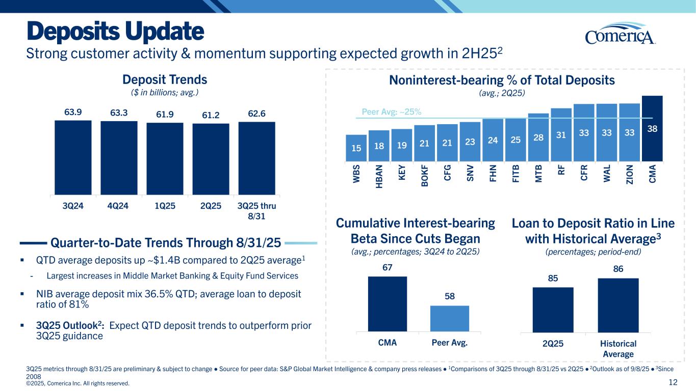 ©2025, Comerica Inc. All rights reserved. 3Q25 metrics through 8/31/25 are preliminary & subject to change ● Source for peer data: S&P Global Market Intelligence & company press releases ● 1Comparisons of 3Q25 through 8/31/25 vs 2Q25 ● 2Outlook as of 9/8/25 ● 3Since 2008 12 Deposits Update Strong customer activity & momentum supporting expected growth in 2H252 Loan to Deposit Ratio in Line with Historical Average3 (percentages; period-end) Noninterest-bearing % of Total Deposits (avg.; 2Q25) 63.9 63.3 61.9 61.2 62.6 3Q24 4Q24 1Q25 2Q25 3Q25 thru 8/31 Deposit Trends ($ in billions; avg.) Quarter-to-Date Trends Through 8/31/25 QTD average deposits up ~$1.4B compared to 2Q25 average1 - Largest increases in Middle Market Banking & Equity Fund Services NIB average deposit mix 36.5% QTD; average loan to deposit ratio of 81% 3Q25 Outlook2: Expect QTD deposit trends to outperform prior 3Q25 guidance Cumulative Interest-bearing Beta Since Cuts Began (avg.; percentages; 3Q24 to 2Q25) 67 58 CMA Peer Avg. 85 86 2Q25 Historical Average 15 18 19 21 21 23 24 25 28 31 33 33 33 38 Peer Avg: ~25% W B S H B A N K EY B O K F C FG S N V FH N FI TB M TB R F C FR W A L ZI O N C M A