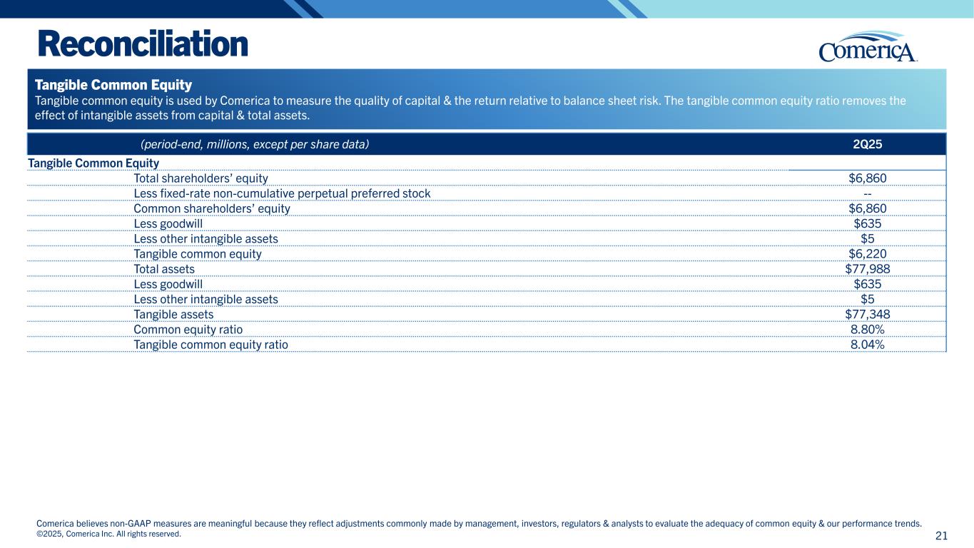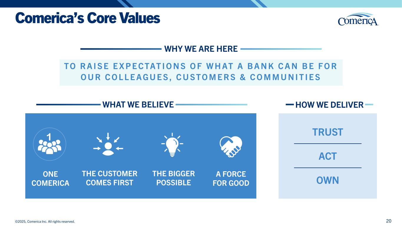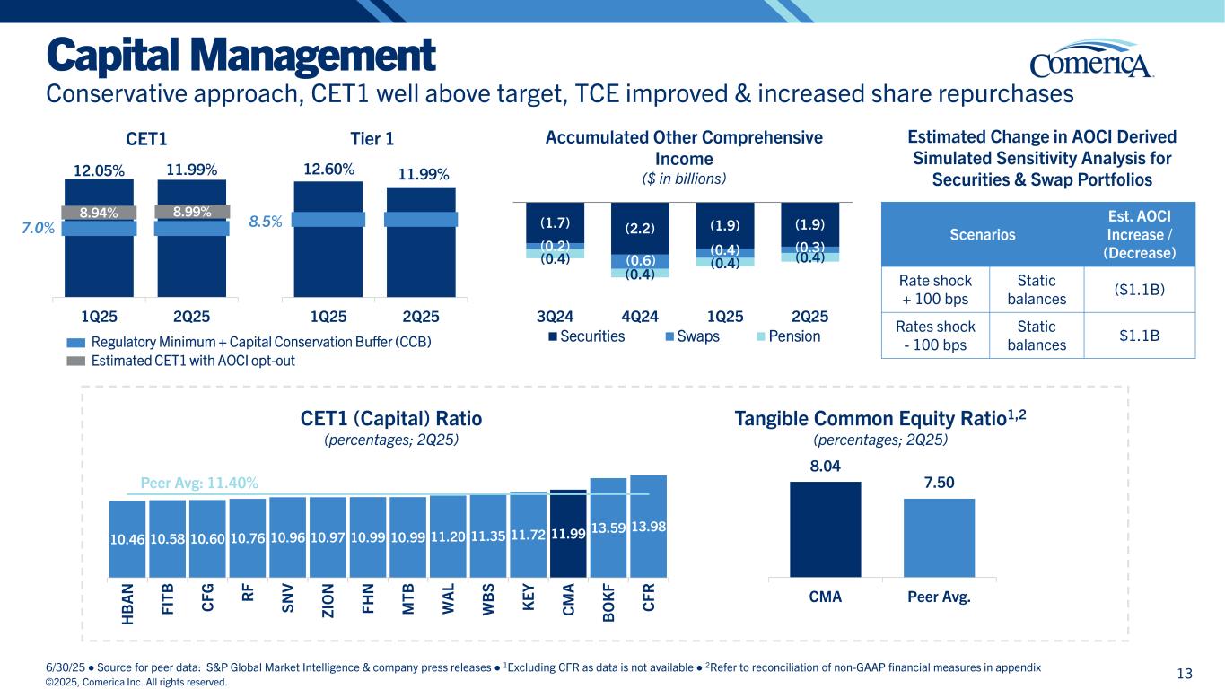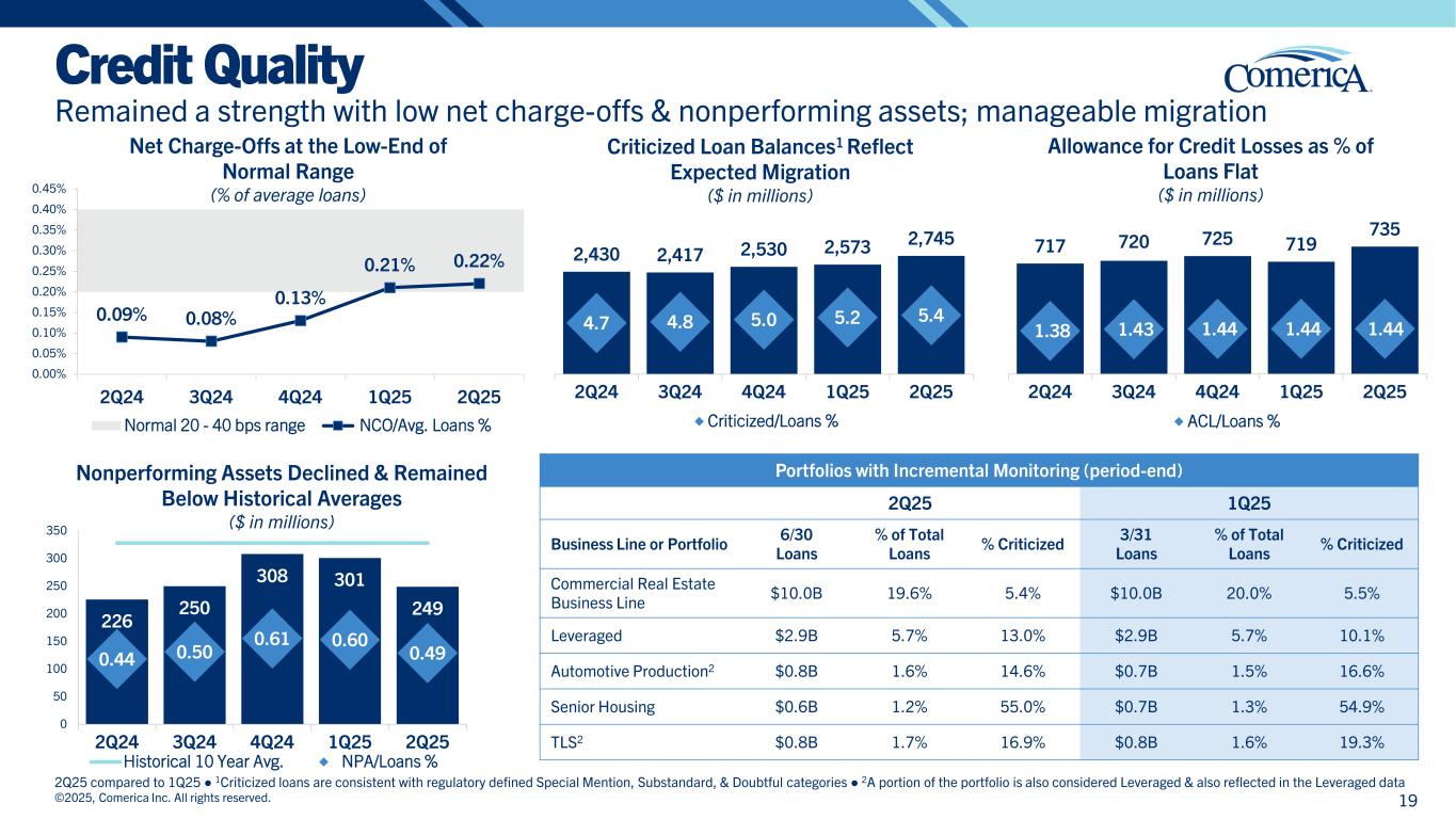 0.09% 0.08% 0.13% 0.21% 0.22% 0.00% 0.05% 0.10% 0.15% 0.20% 0.25% 0.30% 0.35% 0.40% 0.45% 2Q24 3Q24 4Q24 1Q25 2Q25 Normal 20 - 40 bps range NCO/Avg. Loans % Credit Quality Remained a strength with low net charge-offs & nonperforming assets; manageable migration 2Q25 compared to 1Q25 ● 1Criticized loans are consistent with regulatory defined Special Mention, Substandard, & Doubtful categories ● 2A portion of the portfolio is also considered Leveraged & also reflected in the Leveraged data Nonperforming Assets Declined & Remained Below Historical Averages ($ in millions) Criticized Loan Balances1 Reflect Expected Migration ($ in millions) 717 720 725 719 735 1.38 1.43 1.44 1.44 1.44 - 1.00 2.00 3.00 4.00 5.00 6.00 2Q24 3Q24 4Q24 1Q25 2Q25 ACL/Loans % Allowance for Credit Losses as % of Loans Flat ($ in millions) 2,430 2,417 2,530 2,573 2,745 4.7 4.8 5.0 5.2 5.4 - 2.00 4.00 6.00 8.00 10.00 12.00 2Q24 3Q24 4Q24 1Q25 2Q25 Criticized/Loans % ©2025, Comerica Inc. All rights reserved. Net Charge-Offs at the Low-End of Normal Range (% of average loans) Portfolios with Incremental Monitoring (period-end) 2Q25 1Q25 Business Line or Portfolio 6/30 Loans % of Total Loans % Criticized 3/31 Loans % of Total Loans % Criticized Commercial Real Estate Business Line $10.0B 19.6% 5.4% $10.0B 20.0% 5.5% Leveraged $2.9B 5.7% 13.0% $2.9B 5.7% 10.1% Automotive Production2 $0.8B 1.6% 14.6% $0.7B 1.5% 16.6% Senior Housing $0.6B 1.2% 55.0% $0.7B 1.3% 54.9% TLS2 $0.8B 1.7% 16.9% $0.8B 1.6% 19.3% 226 250 308 301 249 0.44 0.50 0.61 0.60 0.49 (0.10) 0.10 0.30 0.50 0.70 0.90 1.10 1.30 1.50 0 50 100 150 200 250 300 350 2Q24 3Q24 4Q24 1Q25 2Q25 Historical 10 Year Avg. NPA/Loans % 19