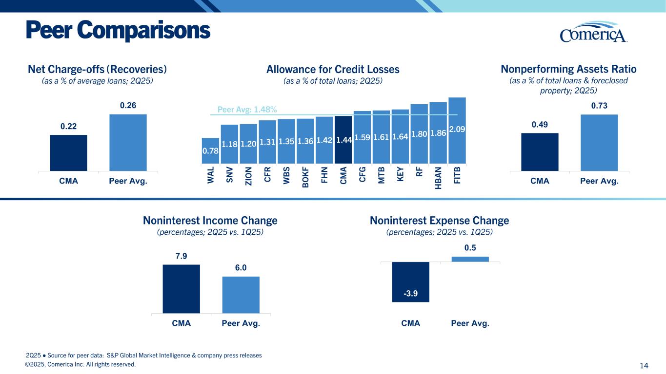 Regulatory Minimum + Capital Conservation Buffer (CCB) (1.7) (2.2) (1.9) (1.9) (0.2) (0.6) (0.4) (0.3) (0.4) (0.4) (0.4) (0.4) 3Q24 4Q24 1Q25 2Q25 Securities Swaps Pension Capital Management Conservative approach, CET1 well above target, TCE improved & increased share repurchases 6/30/25 ● Source for peer data: S&P Global Market Intelligence & company press releases ● 1Excluding CFR as data is not available ● 2Refer to reconciliation of non-GAAP financial measures in appendix 12.05% 11.99% 7.0% 1Q25 2Q25 CET1 Tier 1 12.60% 11.99% 8.5% 1Q25 2Q25 ©2025, Comerica Inc. All rights reserved. Accumulated Other Comprehensive Income ($ in billions) Scenarios Est. AOCI Increase / (Decrease) Rate shock + 100 bps Static balances ($1.1B) Rates shock - 100 bps Static balances $1.1B Estimated Change in AOCI Derived Simulated Sensitivity Analysis for Securities & Swap Portfolios 8.94% Estimated CET1 with AOCI opt-out 8.99% 13 CET1 (Capital) Ratio (percentages; 2Q25) 10.46 10.58 10.60 10.76 10.96 10.97 10.99 10.99 11.20 11.35 11.72 11.99 13.59 13.98 Peer Avg: 11.40% H B A N FI TB C FG R F S N V ZI O N FH N M TB W A L W B S K EY C M A B O K F C FR 8.04 7.50 CMA Peer Avg. Tangible Common Equity Ratio1,2 (percentages; 2Q25)