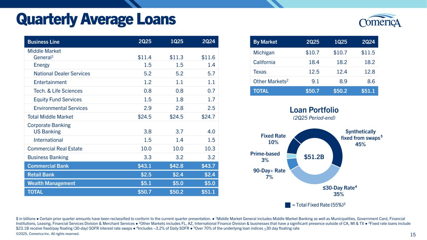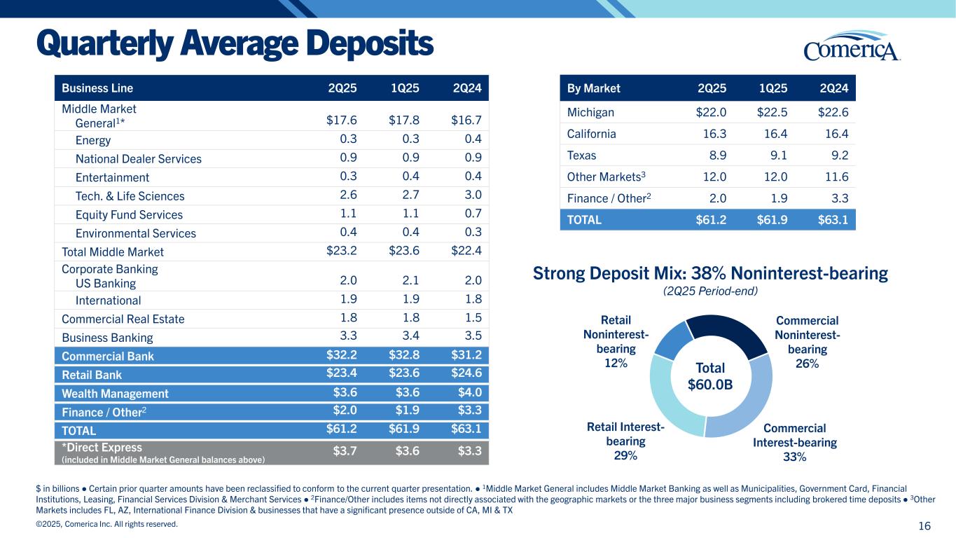 = Total Fixed Rate (55%)3 Business Line 2Q25 1Q25 2Q24 Middle Market General1 $11.4 $11.3 $11.6 Energy 1.5 1.5 1.4 National Dealer Services 5.2 5.2 5.7 Entertainment 1.2 1.1 1.1 Tech. & Life Sciences 0.8 0.8 0.7 Equity Fund Services 1.5 1.8 1.7 Environmental Services 2.9 2.8 2.5 Total Middle Market $24.5 $24.5 $24.7 Corporate Banking US Banking 3.8 3.7 4.0 International 1.5 1.4 1.5 Commercial Real Estate 10.0 10.0 10.3 Business Banking 3.3 3.2 3.2 Commercial Bank $43.1 $42.8 $43.7 Retail Bank $2.5 $2.4 $2.4 Wealth Management $5.1 $5.0 $5.0 TOTAL $50.7 $50.2 $51.1 Quarterly Average Loans $ in billions ● Certain prior quarter amounts have been reclassified to conform to the current quarter presentation. ● 1Middle Market General includes Middle Market Banking as well as Municipalities, Government Card, Financial Institutions, Leasing, Financial Services Division & Merchant Services ● 2Other Markets includes FL, AZ, International Finance Division & businesses that have a significant presence outside of CA, MI & TX ● 3Fixed rate loans include $23.1B receive fixed/pay floating (30-day) SOFR interest rate swaps ● 4Includes ~3.2% of Daily SOFR ● 5Over 70% of the underlying loan indices <30 day floating rate By Market 2Q25 1Q25 2Q24 Michigan $10.7 $10.7 $11.5 California 18.4 18.2 18.2 Texas 12.5 12.4 12.8 Other Markets2 9.1 8.9 8.6 TOTAL $50.7 $50.2 $51.1 ©2025, Comerica Inc. All rights reserved. 15 Fixed Rate 10% Synthetically fixed from swaps 45% ≤30-Day Rate 35% 90-Day+ Rate 7% Prime-based 3% Loan Portfolio (2Q25 Period-end) 4 $51.2B 5
