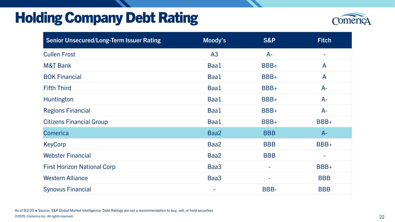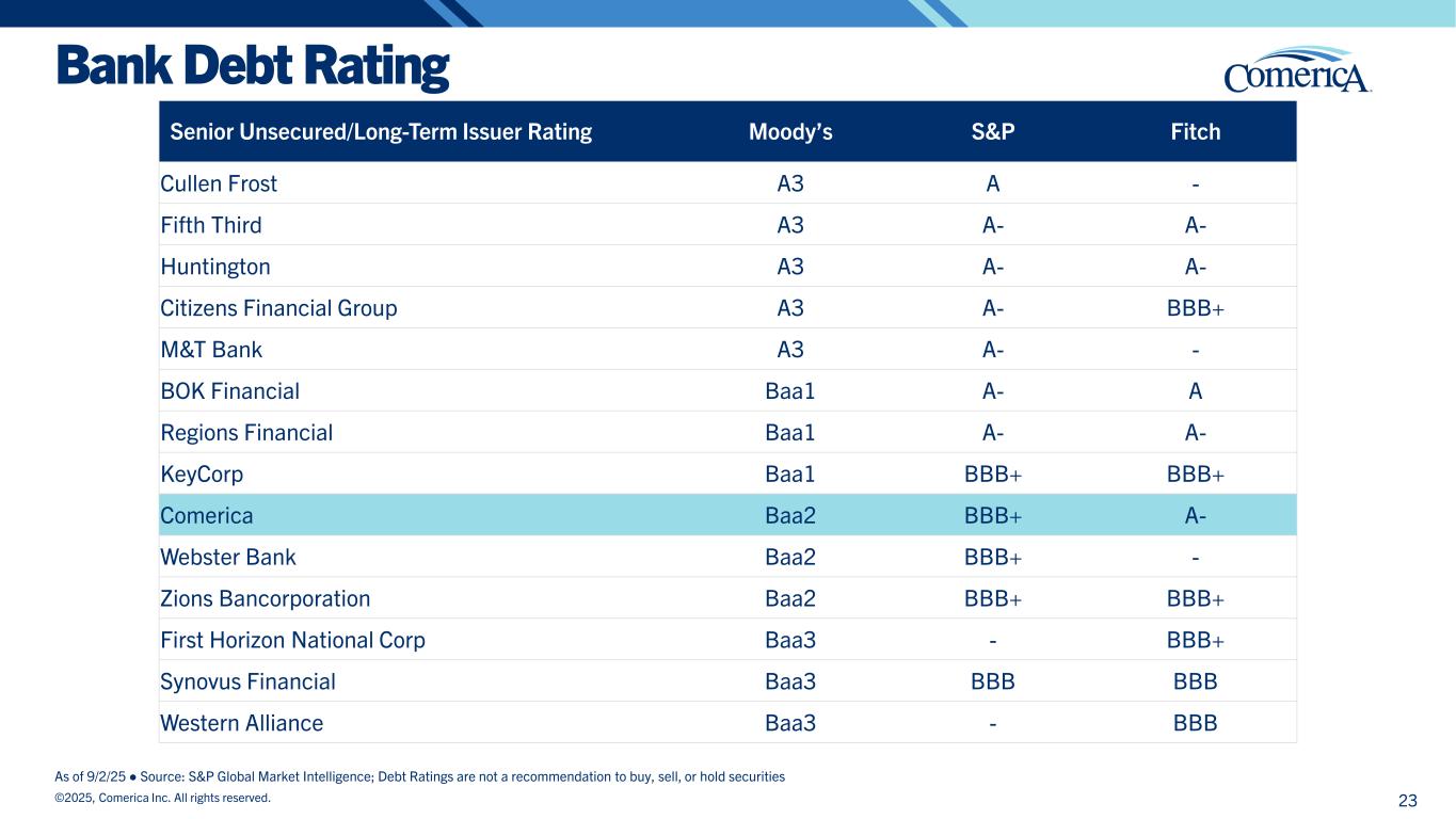 Holding Company Debt Rating As of 9/2/25 ● Source: S&P Global Market Intelligence; Debt Ratings are not a recommendation to buy, sell, or hold securities Senior Unsecured/Long-Term Issuer Rating Moody’s S&P Fitch Cullen Frost A3 A- - M&T Bank Baa1 BBB+ A BOK Financial Baa1 BBB+ A Fifth Third Baa1 BBB+ A- Huntington Baa1 BBB+ A- Regions Financial Baa1 BBB+ A- Citizens Financial Group Baa1 BBB+ BBB+ Comerica Baa2 BBB A- KeyCorp Baa2 BBB BBB+ Webster Financial Baa2 BBB - First Horizon National Corp Baa3 - BBB+ Western Alliance Baa3 - BBB Synovus Financial - BBB- BBB ©2025, Comerica Inc. All rights reserved. 22