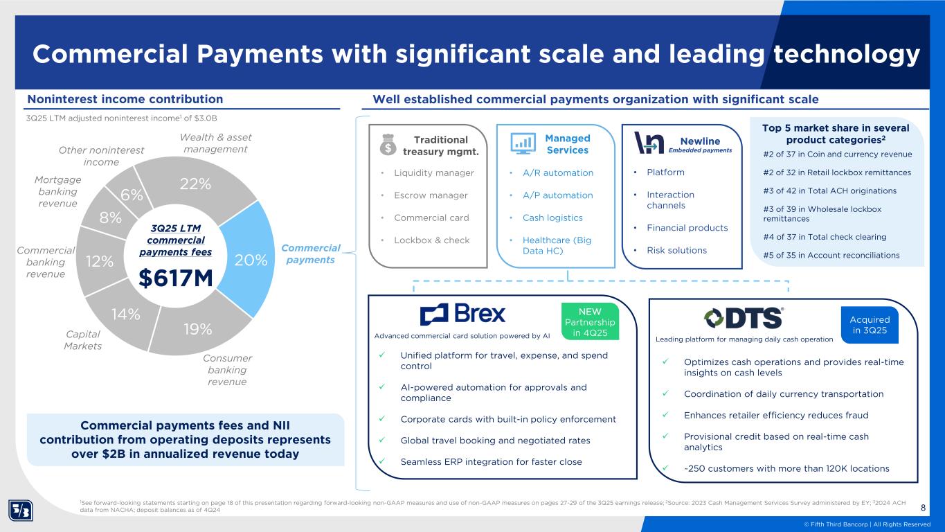 7 © Fifth Third Bancorp | All Rights Reserved De novo expansion leading to strong deposit growth and profitability The southeast’s share of total retail deposits continues to grow as the de novo network matures Percentage of total retail deposits Southeast investments driving strong granular retail deposit growth at attractive rates Disciplined deposit pricing 3Q25 southeast total cost of retail deposits 84% 82% 77% 16% 18% 23% $0 $20 $40 $60 $80 $100 2019 2022 2025 Midwest Southeast 1.93% 4.46% x Avg. FF Rate 48 296 149 Peer Median Trillionaire Median x National Among leaders in de novos built nationally and in footprint 10 96 149 Peer Median Trillionaire Median x Total retail footprint2 Source: S&P Capital IQ, internal management reporting; Note: Branch data as of September 22, 2025, Management reporting reflects data as of September 30, 2025; 12025 FDIC data capped at $250MM and filtered for de novos opened since 2018. Not all de novos have been open for 5 years; 2Retail footprint includes MSAs and counties that Fifth Third has active branches in as of September 22, 2025; 3See forward-looking statements on page 18 of this presentation regarding forward-looking non-GAAP measures and use of non-GAAP measures on pages 27- 29 of the 3Q25 earnings release. De novos built since 2018 Rank 4th Rank 2nd $0 $10 $20 $30 $40 $50 Year 1 Year 2 Year 3 Year 4 Year 5 Fifth Third Peer Avg Average de novo deposits per branch by year1 $ in millions Outsized retail growth across our footprint relative to competitors 5-Year deposit CAGR1 0.5% 1.8% 5.5% Other competitors Trillionaires x Total Retail Footprint2 1.0% 2.1% 12.1% Other competitors Trillionaires x Southeast Retail Footprint2