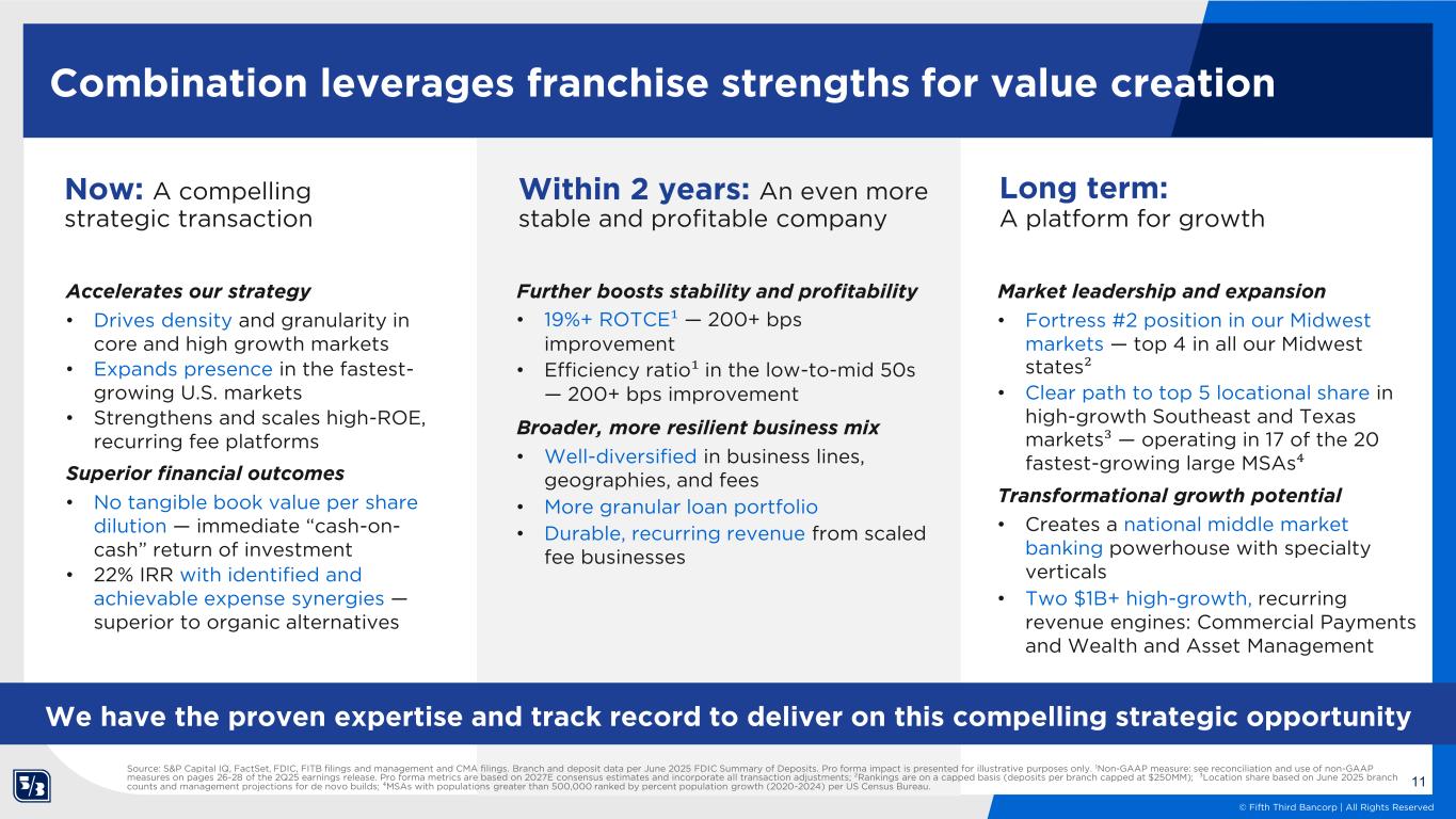 10 © Fifth Third Bancorp | All Rights Reserved Fifth Third and Comerica: Advancing growth and profitability Now: A compelling strategic transaction Within 2 years: An even more stable and profitable company Assets² $288B Deposits² $224B Loans² $174B Creating the 9th Largest U.S. Bank¹ Long-term: A platform for growth Source: S&P Capital IQ, FactSet, FITB filings and management and CMA filings. Financial data as of June 30, 2025. ¹Based on total assets. Ranking consists of US commercial banks and excludes foreign, trust, and traditional investment banks; ²Pro forma balance sheet metrics as of June 30, 2025 and exclude purchase accounting adjustments for illustrative purposes.
