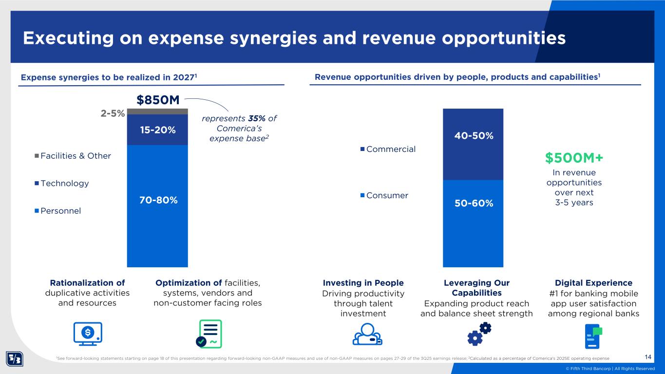 13 © Fifth Third Bancorp | All Rights Reserved Final StepsUpcoming Comerica integration timeline Completed October 6, 2025 Announced acquisition of Comerica October 28, 2025 Filed applications with the OCC and Federal Reserve November 5, 2025 Joint proxy filed January 6, 2026 Shareholder meetings to approve acquisition Early 1Q26 Anticipated regulatory approvals Early 4Q26 Expected conversion of branches and systems 1Q26 Expected legal close of transaction
