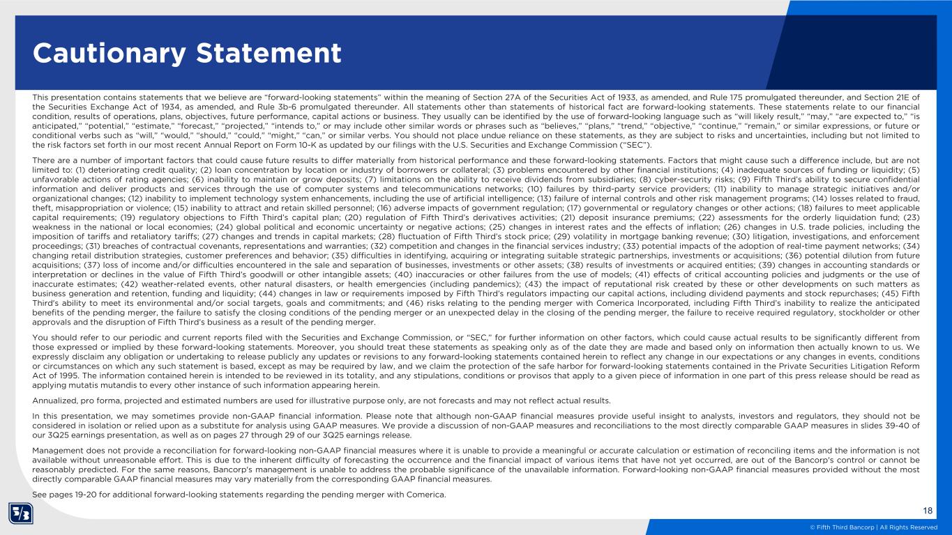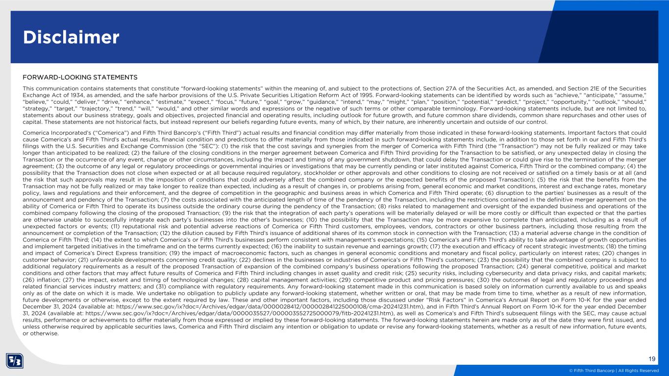 18 © Fifth Third Bancorp | All Rights Reserved This presentation contains statements that we believe are “forward-looking statements” within the meaning of Section 27A of the Securities Act of 1933, as amended, and Rule 175 promulgated thereunder, and Section 21E of the Securities Exchange Act of 1934, as amended, and Rule 3b-6 promulgated thereunder. All statements other than statements of historical fact are forward-looking statements. These statements relate to our financial condition, results of operations, plans, objectives, future performance, capital actions or business. They usually can be identified by the use of forward-looking language such as “will likely result,” “may,” “are expected to,” “is anticipated,” “potential,” “estimate,” “forecast,” “projected,” “intends to,” or may include other similar words or phrases such as “believes,” “plans,” “trend,” “objective,” “continue,” “remain,” or similar expressions, or future or conditional verbs such as “will,” “would,” “should,” “could,” “might,” “can,” or similar verbs. You should not place undue reliance on these statements, as they are subject to risks and uncertainties, including but not limited to the risk factors set forth in our most recent Annual Report on Form 10-K as updated by our filings with the U.S. Securities and Exchange Commission (“SEC”). There are a number of important factors that could cause future results to differ materially from historical performance and these forward-looking statements. Factors that might cause such a difference include, but are not limited to: (1) deteriorating credit quality; (2) loan concentration by location or industry of borrowers or collateral; (3) problems encountered by other financial institutions; (4) inadequate sources of funding or liquidity; (5) unfavorable actions of rating agencies; (6) inability to maintain or grow deposits; (7) limitations on the ability to receive dividends from subsidiaries; (8) cyber-security risks; (9) Fifth Third’s ability to secure confidential information and deliver products and services through the use of computer systems and telecommunications networks; (10) failures by third-party service providers; (11) inability to manage strategic initiatives and/or organizational changes; (12) inability to implement technology system enhancements, including the use of artificial intelligence; (13) failure of internal controls and other risk management programs; (14) losses related to fraud, theft, misappropriation or violence; (15) inability to attract and retain skilled personnel; (16) adverse impacts of government regulation; (17) governmental or regulatory changes or other actions; (18) failures to meet applicable capital requirements; (19) regulatory objections to Fifth Third’s capital plan; (20) regulation of Fifth Third’s derivatives activities; (21) deposit insurance premiums; (22) assessments for the orderly liquidation fund; (23) weakness in the national or local economies; (24) global political and economic uncertainty or negative actions; (25) changes in interest rates and the effects of inflation; (26) changes in U.S. trade policies, including the imposition of tariffs and retaliatory tariffs; (27) changes and trends in capital markets; (28) fluctuation of Fifth Third’s stock price; (29) volatility in mortgage banking revenue; (30) litigation, investigations, and enforcement proceedings; (31) breaches of contractual covenants, representations and warranties; (32) competition and changes in the financial services industry; (33) potential impacts of the adoption of real-time payment networks; (34) changing retail distribution strategies, customer preferences and behavior; (35) difficulties in identifying, acquiring or integrating suitable strategic partnerships, investments or acquisitions; (36) potential dilution from future acquisitions; (37) loss of income and/or difficulties encountered in the sale and separation of businesses, investments or other assets; (38) results of investments or acquired entities; (39) changes in accounting standards or interpretation or declines in the value of Fifth Third’s goodwill or other intangible assets; (40) inaccuracies or other failures from the use of models; (41) effects of critical accounting policies and judgments or the use of inaccurate estimates; (42) weather-related events, other natural disasters, or health emergencies (including pandemics); (43) the impact of reputational risk created by these or other developments on such matters as business generation and retention, funding and liquidity; (44) changes in law or requirements imposed by Fifth Third’s regulators impacting our capital actions, including dividend payments and stock repurchases; (45) Fifth Third's ability to meet its environmental and/or social targets, goals and commitments; and (46) risks relating to the pending merger with Comerica Incorporated, including Fifth Third’s inability to realize the anticipated benefits of the pending merger, the failure to satisfy the closing conditions of the pending merger or an unexpected delay in the closing of the pending merger, the failure to receive required regulatory, stockholder or other approvals and the disruption of Fifth Third’s business as a result of the pending merger. You should refer to our periodic and current reports filed with the Securities and Exchange Commission, or “SEC,” for further information on other factors, which could cause actual results to be significantly different from those expressed or implied by these forward-looking statements. Moreover, you should treat these statements as speaking only as of the date they are made and based only on information then actually known to us. We expressly disclaim any obligation or undertaking to release publicly any updates or revisions to any forward-looking statements contained herein to reflect any change in our expe