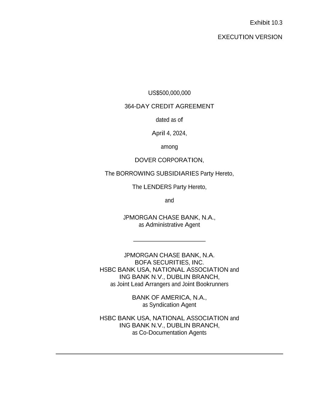 Exhibit 10.3 EXECUTION VERSION US$500,000,000 364-DAY CREDIT AGREEMENT dated as of April 4, 2024, among DOVER CORPORATION, The BORROWING SUBSIDIARIES Party Hereto, The LENDERS Party Hereto, and JPMORGAN CHASE BANK, N.A., as Administrative Agent _______________________ JPMORGAN CHASE BANK, N.A. BOFA SECURITIES, INC. HSBC BANK USA, NATIONAL ASSOCIATION and ING BANK N.V., DUBLIN BRANCH, as Joint Lead Arrangers and Joint Bookrunners BANK OF AMERICA, N.A., as Syndication Agent HSBC BANK USA, NATIONAL ASSOCIATION and ING BANK N.V., DUBLIN BRANCH, as Co-Documentation Agents