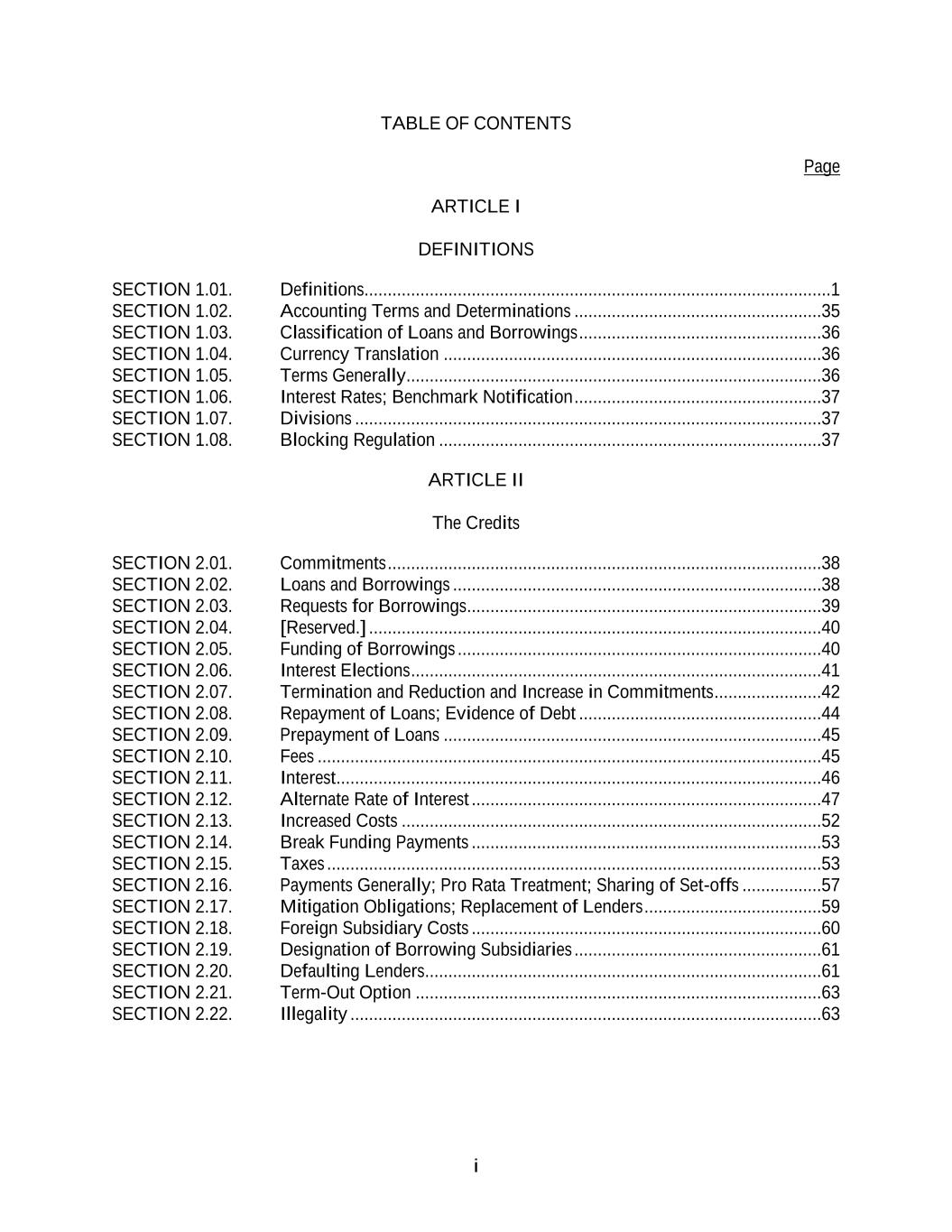 i TABLE OF CONTENTS Page ARTICLE I DEFINITIONS SECTION 1.01. Definitions....................................................................................................1 SECTION 1.02. Accounting Terms and Determinations .....................................................35 SECTION 1.03. Classification of Loans and Borrowings ....................................................36 SECTION 1.04. Currency Translation .................................................................................36 SECTION 1.05. Terms Generally.........................................................................................36 SECTION 1.06. Interest Rates; Benchmark Notification .....................................................37 SECTION 1.07. Divisions ....................................................................................................37 SECTION 1.08. Blocking Regulation ..................................................................................37 ARTICLE II The Credits SECTION 2.01. Commitments .............................................................................................38 SECTION 2.02. Loans and Borrowings ...............................................................................38 SECTION 2.03. Requests for Borrowings............................................................................39 SECTION 2.04. [Reserved.] .................................................................................................40 SECTION 2.05. Funding of Borrowings ..............................................................................40 SECTION 2.06. Interest Elections ........................................................................................41 SECTION 2.07. Termination and Reduction and Increase in Commitments .......................42 SECTION 2.08. Repayment of Loans; Evidence of Debt ....................................................44 SECTION 2.09. Prepayment of Loans .................................................................................45 SECTION 2.10. Fees ............................................................................................................45 SECTION 2.11. Interest........................................................................................................46 SECTION 2.12. Alternate Rate of Interest ...........................................................................47 SECTION 2.13. Increased Costs ..........................................................................................52 SECTION 2.14. Break Funding Payments ...........................................................................53 SECTION 2.15. Taxes ..........................................................................................................53 SECTION 2.16. Payments Generally; Pro Rata Treatment; Sharing of Set-offs .................57 SECTION 2.17. Mitigation Obligations; Replacement of Lenders ......................................59 SECTION 2.18. Foreign Subsidiary Costs ...........................................................................60 SECTION 2.19. Designation of Borrowing Subsidiaries .....................................................61 SECTION 2.20. Defaulting Lenders.....................................................................................61 SECTION 2.21. Term-Out Option .......................................................................................63 SECTION 2.22. Illegality .....................................................................................................63