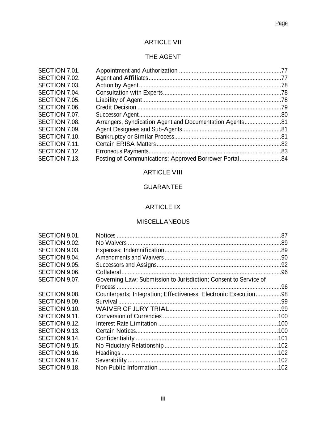 Page iii ARTICLE VII THE AGENT SECTION 7.01. Appointment and Authorization ................................................................77 SECTION 7.02. Agent and Affiliates ...................................................................................77 SECTION 7.03. Action by Agent .........................................................................................78 SECTION 7.04. Consultation with Experts ..........................................................................78 SECTION 7.05. Liability of Agent .......................................................................................78 SECTION 7.06. Credit Decision ..........................................................................................79 SECTION 7.07. Successor Agent .........................................................................................80 SECTION 7.08. Arrangers, Syndication Agent and Documentation Agents .......................81 SECTION 7.09. Agent Designees and Sub-Agents ..............................................................81 SECTION 7.10. Bankruptcy or Similar Process...................................................................81 SECTION 7.11. Certain ERISA Matters ..............................................................................82 SECTION 7.12. Erroneous Payments...................................................................................83 SECTION 7.13. Posting of Communications; Approved Borrower Portal ..........................84 ARTICLE VIII GUARANTEE ARTICLE IX MISCELLANEOUS SECTION 9.01. Notices .......................................................................................................87 SECTION 9.02. No Waivers ................................................................................................89 SECTION 9.03. Expenses; Indemnification .........................................................................89 SECTION 9.04. Amendments and Waivers .........................................................................90 SECTION 9.05. Successors and Assigns..............................................................................92 SECTION 9.06. Collateral ....................................................................................................96 SECTION 9.07. Governing Law; Submission to Jurisdiction; Consent to Service of Process .......................................................................................................96 SECTION 9.08. Counterparts; Integration; Effectiveness; Electronic Execution ................98 SECTION 9.09. Survival ......................................................................................................99 SECTION 9.10. WAIVER OF JURY TRIAL ......................................................................99 SECTION 9.11. Conversion of Currencies ........................................................................100 SECTION 9.12. Interest Rate Limitation ...........................................................................100 SECTION 9.13. Certain Notices.........................................................................................100 SECTION 9.14. Confidentiality .........................................................................................101 SECTION 9.15. No Fiduciary Relationship .......................................................................102 SECTION 9.16. Headings ..................................................................................................102 SECTION 9.17. Severability ..............................................................................................102 SECTION 9.18. Non-Public Information ...........................................................................102