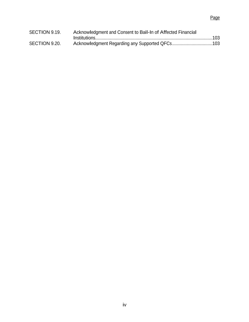 Page iv SECTION 9.19. Acknowledgment and Consent to Bail-In of Affected Financial Institutions................................................................................................103 SECTION 9.20. Acknowledgment Regarding any Supported QFCs .................................103