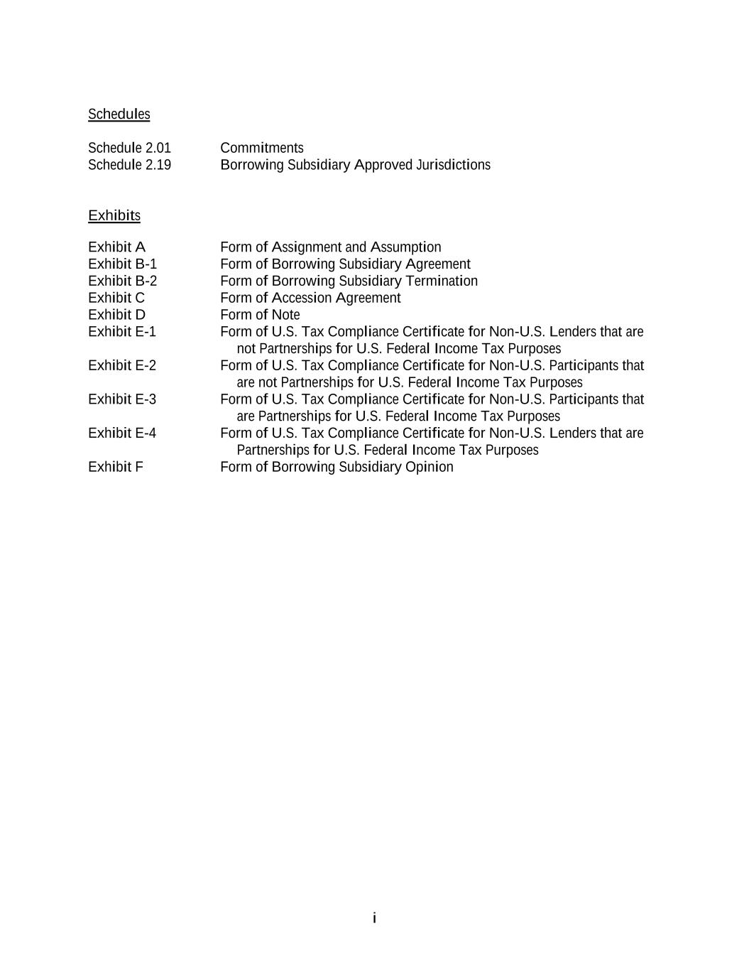 i Schedules Schedule 2.01 Commitments Schedule 2.19 Borrowing Subsidiary Approved Jurisdictions Exhibits Exhibit A Form of Assignment and Assumption Exhibit B-1 Form of Borrowing Subsidiary Agreement Exhibit B-2 Form of Borrowing Subsidiary Termination Exhibit C Form of Accession Agreement Exhibit D Form of Note Exhibit E-1 Form of U.S. Tax Compliance Certificate for Non-U.S. Lenders that are not Partnerships for U.S. Federal Income Tax Purposes Exhibit E-2 Form of U.S. Tax Compliance Certificate for Non-U.S. Participants that are not Partnerships for U.S. Federal Income Tax Purposes Exhibit E-3 Form of U.S. Tax Compliance Certificate for Non-U.S. Participants that are Partnerships for U.S. Federal Income Tax Purposes Exhibit E-4 Form of U.S. Tax Compliance Certificate for Non-U.S. Lenders that are Partnerships for U.S. Federal Income Tax Purposes Exhibit F Form of Borrowing Subsidiary Opinion