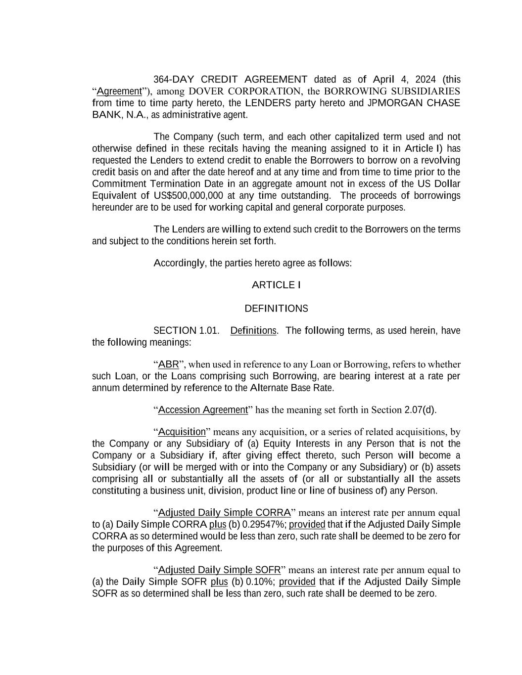 364-DAY CREDIT AGREEMENT dated as of April 4, 2024 (this “Agreement”), among DOVER CORPORATION, the BORROWING SUBSIDIARIES from time to time party hereto, the LENDERS party hereto and JPMORGAN CHASE BANK, N.A., as administrative agent. The Company (such term, and each other capitalized term used and not otherwise defined in these recitals having the meaning assigned to it in Article I) has requested the Lenders to extend credit to enable the Borrowers to borrow on a revolving credit basis on and after the date hereof and at any time and from time to time prior to the Commitment Termination Date in an aggregate amount not in excess of the US Dollar Equivalent of US$500,000,000 at any time outstanding. The proceeds of borrowings hereunder are to be used for working capital and general corporate purposes. The Lenders are willing to extend such credit to the Borrowers on the terms and subject to the conditions herein set forth. Accordingly, the parties hereto agree as follows: ARTICLE I DEFINITIONS SECTION 1.01. Definitions. The following terms, as used herein, have the following meanings: “ABR”, when used in reference to any Loan or Borrowing, refers to whether such Loan, or the Loans comprising such Borrowing, are bearing interest at a rate per annum determined by reference to the Alternate Base Rate. “Accession Agreement” has the meaning set forth in Section 2.07(d). “Acquisition” means any acquisition, or a series of related acquisitions, by the Company or any Subsidiary of (a) Equity Interests in any Person that is not the Company or a Subsidiary if, after giving effect thereto, such Person will become a Subsidiary (or will be merged with or into the Company or any Subsidiary) or (b) assets comprising all or substantially all the assets of (or all or substantially all the assets constituting a business unit, division, product line or line of business of) any Person. “Adjusted Daily Simple CORRA” means an interest rate per annum equal to (a) Daily Simple CORRA plus (b) 0.29547%; provided that if the Adjusted Daily Simple CORRA as so determined would be less than zero, such rate shall be deemed to be zero for the purposes of this Agreement. “Adjusted Daily Simple SOFR” means an interest rate per annum equal to (a) the Daily Simple SOFR plus (b) 0.10%; provided that if the Adjusted Daily Simple SOFR as so determined shall be less than zero, such rate shall be deemed to be zero.