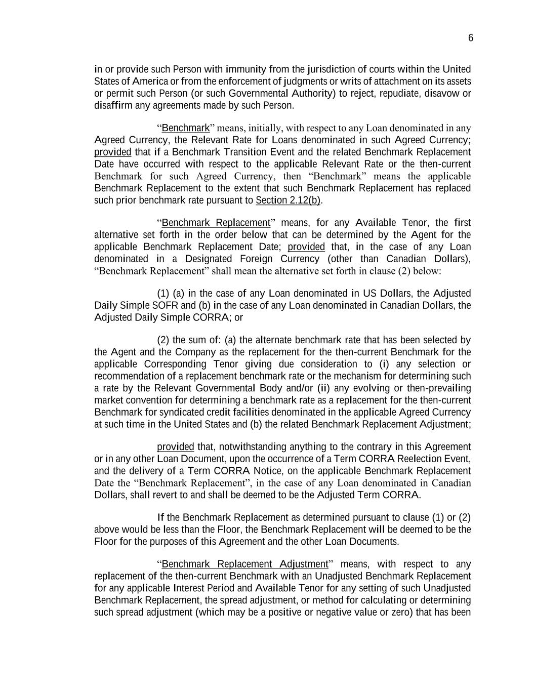 6 in or provide such Person with immunity from the jurisdiction of courts within the United States of America or from the enforcement of judgments or writs of attachment on its assets or permit such Person (or such Governmental Authority) to reject, repudiate, disavow or disaffirm any agreements made by such Person. “Benchmark” means, initially, with respect to any Loan denominated in any Agreed Currency, the Relevant Rate for Loans denominated in such Agreed Currency; provided that if a Benchmark Transition Event and the related Benchmark Replacement Date have occurred with respect to the applicable Relevant Rate or the then-current Benchmark for such Agreed Currency, then “Benchmark” means the applicable Benchmark Replacement to the extent that such Benchmark Replacement has replaced such prior benchmark rate pursuant to Section 2.12(b). “Benchmark Replacement” means, for any Available Tenor, the first alternative set forth in the order below that can be determined by the Agent for the applicable Benchmark Replacement Date; provided that, in the case of any Loan denominated in a Designated Foreign Currency (other than Canadian Dollars), “Benchmark Replacement” shall mean the alternative set forth in clause (2) below: (1) (a) in the case of any Loan denominated in US Dollars, the Adjusted Daily Simple SOFR and (b) in the case of any Loan denominated in Canadian Dollars, the Adjusted Daily Simple CORRA; or (2) the sum of: (a) the alternate benchmark rate that has been selected by the Agent and the Company as the replacement for the then-current Benchmark for the applicable Corresponding Tenor giving due consideration to (i) any selection or recommendation of a replacement benchmark rate or the mechanism for determining such a rate by the Relevant Governmental Body and/or (ii) any evolving or then-prevailing market convention for determining a benchmark rate as a replacement for the then-current Benchmark for syndicated credit facilities denominated in the applicable Agreed Currency at such time in the United States and (b) the related Benchmark Replacement Adjustment; provided that, notwithstanding anything to the contrary in this Agreement or in any other Loan Document, upon the occurrence of a Term CORRA Reelection Event, and the delivery of a Term CORRA Notice, on the applicable Benchmark Replacement Date the “Benchmark Replacement”, in the case of any Loan denominated in Canadian Dollars, shall revert to and shall be deemed to be the Adjusted Term CORRA. If the Benchmark Replacement as determined pursuant to clause (1) or (2) above would be less than the Floor, the Benchmark Replacement will be deemed to be the Floor for the purposes of this Agreement and the other Loan Documents. “Benchmark Replacement Adjustment” means, with respect to any replacement of the then-current Benchmark with an Unadjusted Benchmark Replacement for any applicable Interest Period and Available Tenor for any setting of such Unadjusted Benchmark Replacement, the spread adjustment, or method for calculating or determining such spread adjustment (which may be a positive or negative value or zero) that has been