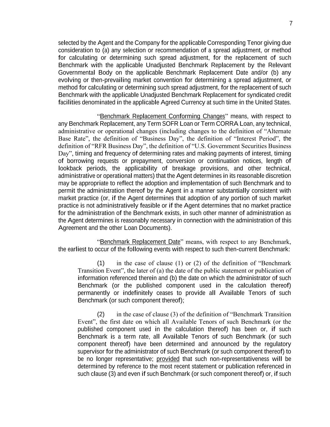 7 selected by the Agent and the Company for the applicable Corresponding Tenor giving due consideration to (a) any selection or recommendation of a spread adjustment, or method for calculating or determining such spread adjustment, for the replacement of such Benchmark with the applicable Unadjusted Benchmark Replacement by the Relevant Governmental Body on the applicable Benchmark Replacement Date and/or (b) any evolving or then-prevailing market convention for determining a spread adjustment, or method for calculating or determining such spread adjustment, for the replacement of such Benchmark with the applicable Unadjusted Benchmark Replacement for syndicated credit facilities denominated in the applicable Agreed Currency at such time in the United States. “Benchmark Replacement Conforming Changes” means, with respect to any Benchmark Replacement, any Term SOFR Loan or Term CORRA Loan, any technical, administrative or operational changes (including changes to the definition of “Alternate Base Rate”, the definition of “Business Day”, the definition of “Interest Period”, the definition of “RFR Business Day”, the definition of “U.S. Government Securities Business Day”, timing and frequency of determining rates and making payments of interest, timing of borrowing requests or prepayment, conversion or continuation notices, length of lookback periods, the applicability of breakage provisions, and other technical, administrative or operational matters) that the Agent determines in its reasonable discretion may be appropriate to reflect the adoption and implementation of such Benchmark and to permit the administration thereof by the Agent in a manner substantially consistent with market practice (or, if the Agent determines that adoption of any portion of such market practice is not administratively feasible or if the Agent determines that no market practice for the administration of the Benchmark exists, in such other manner of administration as the Agent determines is reasonably necessary in connection with the administration of this Agreement and the other Loan Documents). “Benchmark Replacement Date” means, with respect to any Benchmark, the earliest to occur of the following events with respect to such then-current Benchmark: (1) in the case of clause (1) or (2) of the definition of “Benchmark Transition Event”, the later of (a) the date of the public statement or publication of information referenced therein and (b) the date on which the administrator of such Benchmark (or the published component used in the calculation thereof) permanently or indefinitely ceases to provide all Available Tenors of such Benchmark (or such component thereof); (2) in the case of clause (3) of the definition of “Benchmark Transition Event”, the first date on which all Available Tenors of such Benchmark (or the published component used in the calculation thereof) has been or, if such Benchmark is a term rate, all Available Tenors of such Benchmark (or such component thereof) have been determined and announced by the regulatory supervisor for the administrator of such Benchmark (or such component thereof) to be no longer representative; provided that such non-representativeness will be determined by reference to the most recent statement or publication referenced in such clause (3) and even if such Benchmark (or such component thereof) or, if such