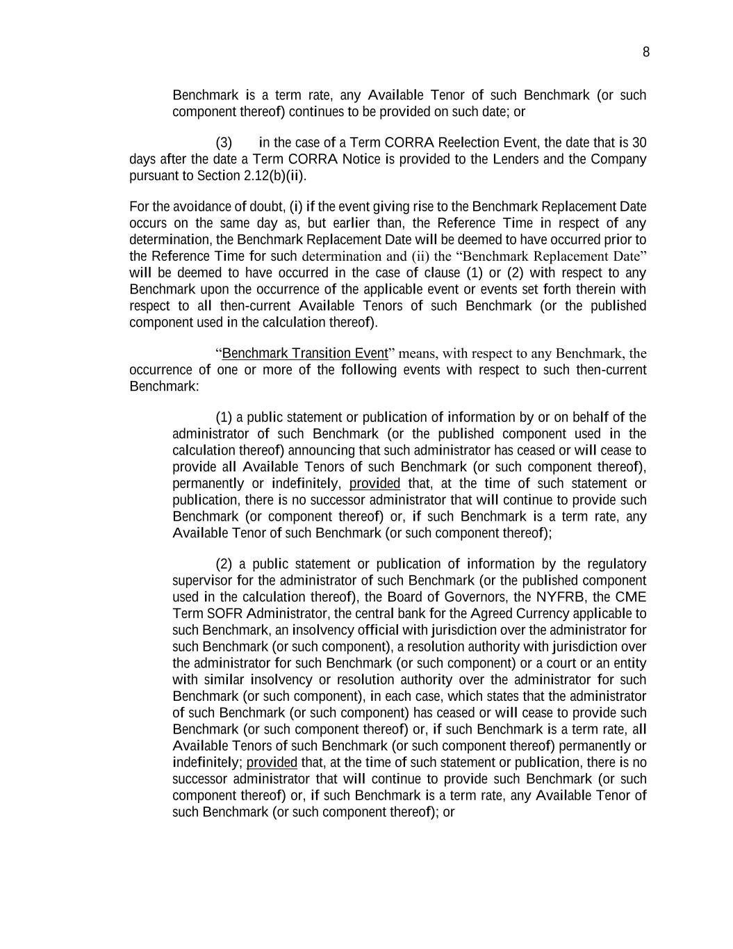 8 Benchmark is a term rate, any Available Tenor of such Benchmark (or such component thereof) continues to be provided on such date; or (3) in the case of a Term CORRA Reelection Event, the date that is 30 days after the date a Term CORRA Notice is provided to the Lenders and the Company pursuant to Section 2.12(b)(ii). For the avoidance of doubt, (i) if the event giving rise to the Benchmark Replacement Date occurs on the same day as, but earlier than, the Reference Time in respect of any determination, the Benchmark Replacement Date will be deemed to have occurred prior to the Reference Time for such determination and (ii) the “Benchmark Replacement Date” will be deemed to have occurred in the case of clause (1) or (2) with respect to any Benchmark upon the occurrence of the applicable event or events set forth therein with respect to all then-current Available Tenors of such Benchmark (or the published component used in the calculation thereof). “Benchmark Transition Event” means, with respect to any Benchmark, the occurrence of one or more of the following events with respect to such then-current Benchmark: (1) a public statement or publication of information by or on behalf of the administrator of such Benchmark (or the published component used in the calculation thereof) announcing that such administrator has ceased or will cease to provide all Available Tenors of such Benchmark (or such component thereof), permanently or indefinitely, provided that, at the time of such statement or publication, there is no successor administrator that will continue to provide such Benchmark (or component thereof) or, if such Benchmark is a term rate, any Available Tenor of such Benchmark (or such component thereof); (2) a public statement or publication of information by the regulatory supervisor for the administrator of such Benchmark (or the published component used in the calculation thereof), the Board of Governors, the NYFRB, the CME Term SOFR Administrator, the central bank for the Agreed Currency applicable to such Benchmark, an insolvency official with jurisdiction over the administrator for such Benchmark (or such component), a resolution authority with jurisdiction over the administrator for such Benchmark (or such component) or a court or an entity with similar insolvency or resolution authority over the administrator for such Benchmark (or such component), in each case, which states that the administrator of such Benchmark (or such component) has ceased or will cease to provide such Benchmark (or such component thereof) or, if such Benchmark is a term rate, all Available Tenors of such Benchmark (or such component thereof) permanently or indefinitely; provided that, at the time of such statement or publication, there is no successor administrator that will continue to provide such Benchmark (or such component thereof) or, if such Benchmark is a term rate, any Available Tenor of such Benchmark (or such component thereof); or