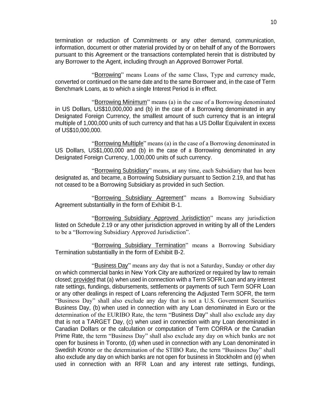 10 termination or reduction of Commitments or any other demand, communication, information, document or other material provided by or on behalf of any of the Borrowers pursuant to this Agreement or the transactions contemplated herein that is distributed by any Borrower to the Agent, including through an Approved Borrower Portal. “Borrowing” means Loans of the same Class, Type and currency made, converted or continued on the same date and to the same Borrower and, in the case of Term Benchmark Loans, as to which a single Interest Period is in effect. “Borrowing Minimum” means (a) in the case of a Borrowing denominated in US Dollars, US$10,000,000 and (b) in the case of a Borrowing denominated in any Designated Foreign Currency, the smallest amount of such currency that is an integral multiple of 1,000,000 units of such currency and that has a US Dollar Equivalent in excess of US$10,000,000. “Borrowing Multiple” means (a) in the case of a Borrowing denominated in US Dollars, US$1,000,000 and (b) in the case of a Borrowing denominated in any Designated Foreign Currency, 1,000,000 units of such currency. “Borrowing Subsidiary” means, at any time, each Subsidiary that has been designated as, and became, a Borrowing Subsidiary pursuant to Section 2.19, and that has not ceased to be a Borrowing Subsidiary as provided in such Section. “Borrowing Subsidiary Agreement” means a Borrowing Subsidiary Agreement substantially in the form of Exhibit B-1. “Borrowing Subsidiary Approved Jurisdiction” means any jurisdiction listed on Schedule 2.19 or any other jurisdiction approved in writing by all of the Lenders to be a “Borrowing Subsidiary Approved Jurisdiction”. “Borrowing Subsidiary Termination” means a Borrowing Subsidiary Termination substantially in the form of Exhibit B-2. “Business Day” means any day that is not a Saturday, Sunday or other day on which commercial banks in New York City are authorized or required by law to remain closed; provided that (a) when used in connection with a Term SOFR Loan and any interest rate settings, fundings, disbursements, settlements or payments of such Term SOFR Loan or any other dealings in respect of Loans referencing the Adjusted Term SOFR, the term “Business Day” shall also exclude any day that is not a U.S. Government Securities Business Day, (b) when used in connection with any Loan denominated in Euro or the determination of the EURIBO Rate, the term “Business Day” shall also exclude any day that is not a TARGET Day, (c) when used in connection with any Loan denominated in Canadian Dollars or the calculation or computation of Term CORRA or the Canadian Prime Rate, the term “Business Day” shall also exclude any day on which banks are not open for business in Toronto, (d) when used in connection with any Loan denominated in Swedish Kronor or the determination of the STIBO Rate, the term “Business Day” shall also exclude any day on which banks are not open for business in Stockholm and (e) when used in connection with an RFR Loan and any interest rate settings, fundings,