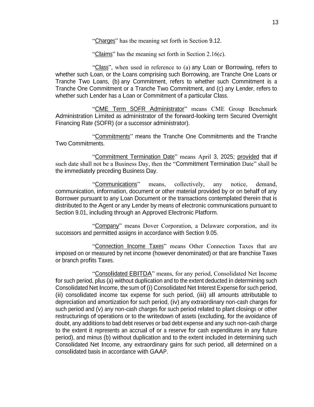 13 “Charges” has the meaning set forth in Section 9.12. “Claims” has the meaning set forth in Section 2.16(c). “Class”, when used in reference to (a) any Loan or Borrowing, refers to whether such Loan, or the Loans comprising such Borrowing, are Tranche One Loans or Tranche Two Loans, (b) any Commitment, refers to whether such Commitment is a Tranche One Commitment or a Tranche Two Commitment, and (c) any Lender, refers to whether such Lender has a Loan or Commitment of a particular Class. “CME Term SOFR Administrator” means CME Group Benchmark Administration Limited as administrator of the forward-looking term Secured Overnight Financing Rate (SOFR) (or a successor administrator). “Commitments” means the Tranche One Commitments and the Tranche Two Commitments. “Commitment Termination Date” means April 3, 2025; provided that if such date shall not be a Business Day, then the “Commitment Termination Date” shall be the immediately preceding Business Day. “Communications” means, collectively, any notice, demand, communication, information, document or other material provided by or on behalf of any Borrower pursuant to any Loan Document or the transactions contemplated therein that is distributed to the Agent or any Lender by means of electronic communications pursuant to Section 9.01, including through an Approved Electronic Platform. “Company” means Dover Corporation, a Delaware corporation, and its successors and permitted assigns in accordance with Section 9.05. “Connection Income Taxes” means Other Connection Taxes that are imposed on or measured by net income (however denominated) or that are franchise Taxes or branch profits Taxes. “Consolidated EBITDA” means, for any period, Consolidated Net Income for such period, plus (a) without duplication and to the extent deducted in determining such Consolidated Net Income, the sum of (i) Consolidated Net Interest Expense for such period, (ii) consolidated income tax expense for such period, (iii) all amounts attributable to depreciation and amortization for such period, (iv) any extraordinary non-cash charges for such period and (v) any non-cash charges for such period related to plant closings or other restructurings of operations or to the writedown of assets (excluding, for the avoidance of doubt, any additions to bad debt reserves or bad debt expense and any such non-cash charge to the extent it represents an accrual of or a reserve for cash expenditures in any future period), and minus (b) without duplication and to the extent included in determining such Consolidated Net Income, any extraordinary gains for such period, all determined on a consolidated basis in accordance with GAAP.
