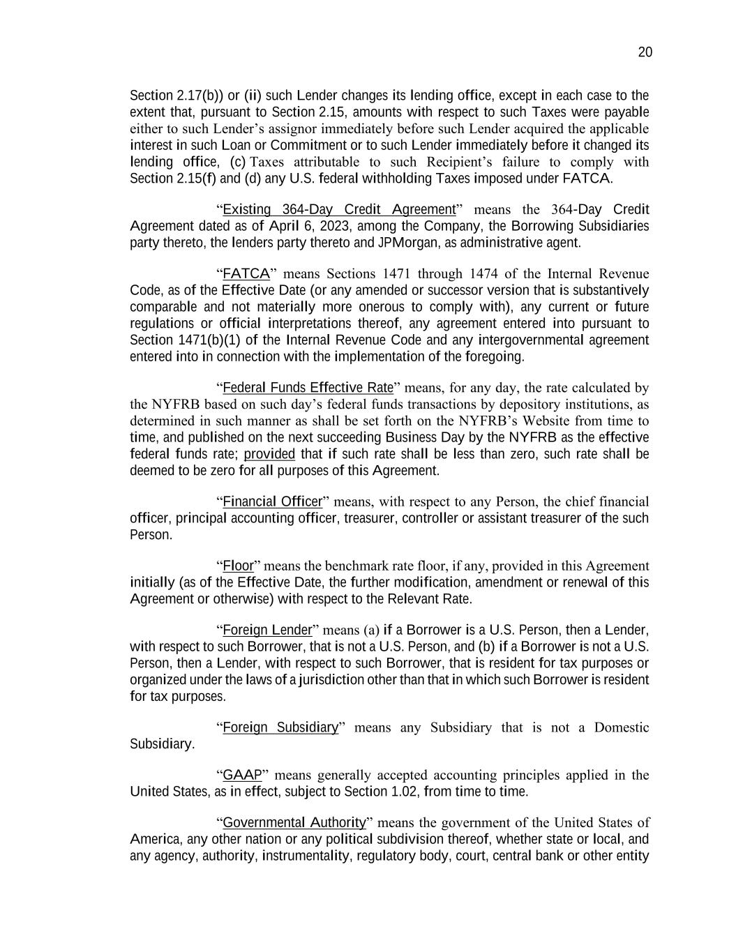 20 Section 2.17(b)) or (ii) such Lender changes its lending office, except in each case to the extent that, pursuant to Section 2.15, amounts with respect to such Taxes were payable either to such Lender’s assignor immediately before such Lender acquired the applicable interest in such Loan or Commitment or to such Lender immediately before it changed its lending office, (c) Taxes attributable to such Recipient’s failure to comply with Section 2.15(f) and (d) any U.S. federal withholding Taxes imposed under FATCA. “Existing 364-Day Credit Agreement” means the 364-Day Credit Agreement dated as of April 6, 2023, among the Company, the Borrowing Subsidiaries party thereto, the lenders party thereto and JPMorgan, as administrative agent. “FATCA” means Sections 1471 through 1474 of the Internal Revenue Code, as of the Effective Date (or any amended or successor version that is substantively comparable and not materially more onerous to comply with), any current or future regulations or official interpretations thereof, any agreement entered into pursuant to Section 1471(b)(1) of the Internal Revenue Code and any intergovernmental agreement entered into in connection with the implementation of the foregoing. “Federal Funds Effective Rate” means, for any day, the rate calculated by the NYFRB based on such day’s federal funds transactions by depository institutions, as determined in such manner as shall be set forth on the NYFRB’s Website from time to time, and published on the next succeeding Business Day by the NYFRB as the effective federal funds rate; provided that if such rate shall be less than zero, such rate shall be deemed to be zero for all purposes of this Agreement. “Financial Officer” means, with respect to any Person, the chief financial officer, principal accounting officer, treasurer, controller or assistant treasurer of the such Person. “Floor” means the benchmark rate floor, if any, provided in this Agreement initially (as of the Effective Date, the further modification, amendment or renewal of this Agreement or otherwise) with respect to the Relevant Rate. “Foreign Lender” means (a) if a Borrower is a U.S. Person, then a Lender, with respect to such Borrower, that is not a U.S. Person, and (b) if a Borrower is not a U.S. Person, then a Lender, with respect to such Borrower, that is resident for tax purposes or organized under the laws of a jurisdiction other than that in which such Borrower is resident for tax purposes. “Foreign Subsidiary” means any Subsidiary that is not a Domestic Subsidiary. “GAAP” means generally accepted accounting principles applied in the United States, as in effect, subject to Section 1.02, from time to time. “Governmental Authority” means the government of the United States of America, any other nation or any political subdivision thereof, whether state or local, and any agency, authority, instrumentality, regulatory body, court, central bank or other entity