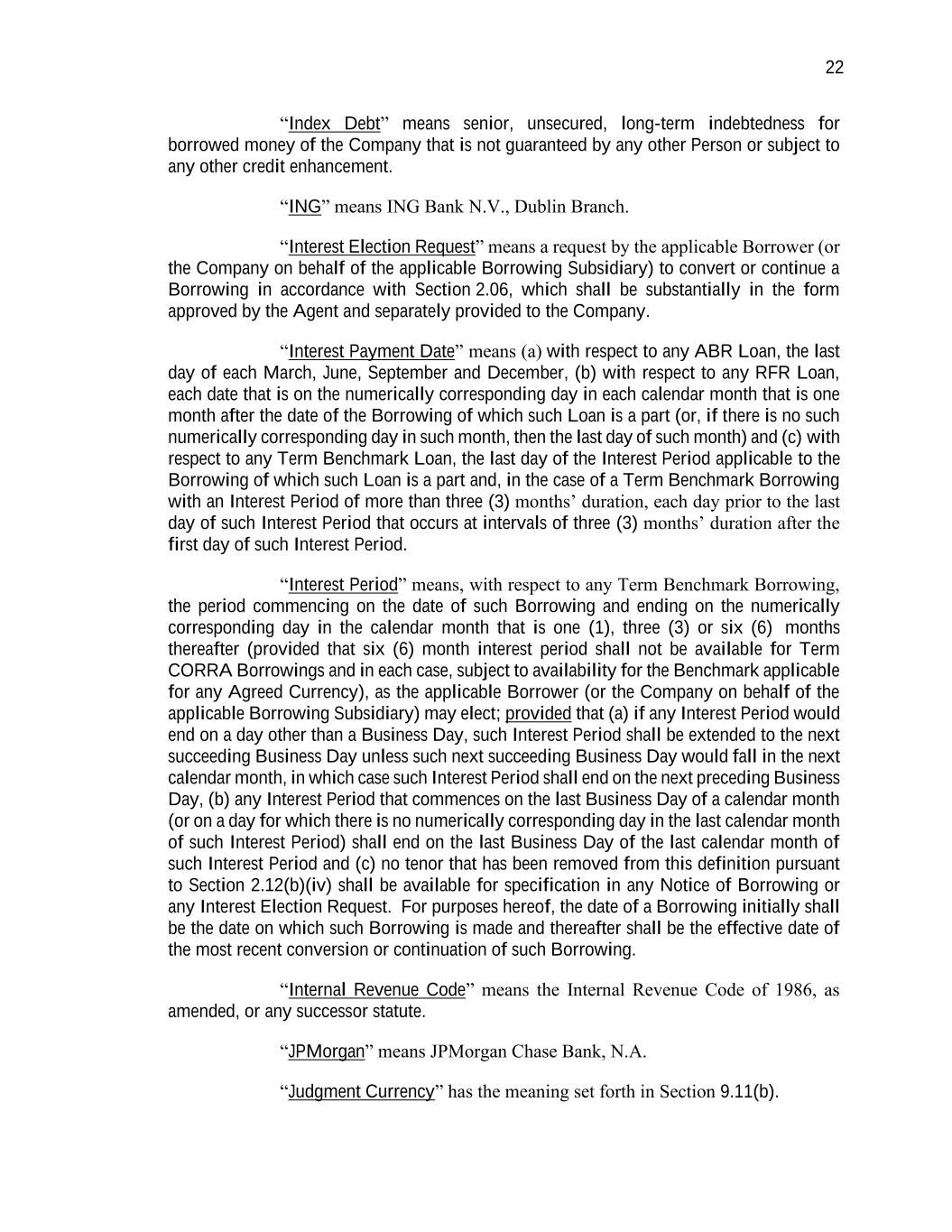 22 “Index Debt” means senior, unsecured, long-term indebtedness for borrowed money of the Company that is not guaranteed by any other Person or subject to any other credit enhancement. “ING” means ING Bank N.V., Dublin Branch. “Interest Election Request” means a request by the applicable Borrower (or the Company on behalf of the applicable Borrowing Subsidiary) to convert or continue a Borrowing in accordance with Section 2.06, which shall be substantially in the form approved by the Agent and separately provided to the Company. “Interest Payment Date” means (a) with respect to any ABR Loan, the last day of each March, June, September and December, (b) with respect to any RFR Loan, each date that is on the numerically corresponding day in each calendar month that is one month after the date of the Borrowing of which such Loan is a part (or, if there is no such numerically corresponding day in such month, then the last day of such month) and (c) with respect to any Term Benchmark Loan, the last day of the Interest Period applicable to the Borrowing of which such Loan is a part and, in the case of a Term Benchmark Borrowing with an Interest Period of more than three (3) months’ duration, each day prior to the last day of such Interest Period that occurs at intervals of three (3) months’ duration after the first day of such Interest Period. “Interest Period” means, with respect to any Term Benchmark Borrowing, the period commencing on the date of such Borrowing and ending on the numerically corresponding day in the calendar month that is one (1), three (3) or six (6) months thereafter (provided that six (6) month interest period shall not be available for Term CORRA Borrowings and in each case, subject to availability for the Benchmark applicable for any Agreed Currency), as the applicable Borrower (or the Company on behalf of the applicable Borrowing Subsidiary) may elect; provided that (a) if any Interest Period would end on a day other than a Business Day, such Interest Period shall be extended to the next succeeding Business Day unless such next succeeding Business Day would fall in the next calendar month, in which case such Interest Period shall end on the next preceding Business Day, (b) any Interest Period that commences on the last Business Day of a calendar month (or on a day for which there is no numerically corresponding day in the last calendar month of such Interest Period) shall end on the last Business Day of the last calendar month of such Interest Period and (c) no tenor that has been removed from this definition pursuant to Section 2.12(b)(iv) shall be available for specification in any Notice of Borrowing or any Interest Election Request. For purposes hereof, the date of a Borrowing initially shall be the date on which such Borrowing is made and thereafter shall be the effective date of the most recent conversion or continuation of such Borrowing. “Internal Revenue Code” means the Internal Revenue Code of 1986, as amended, or any successor statute. “JPMorgan” means JPMorgan Chase Bank, N.A. “Judgment Currency” has the meaning set forth in Section 9.11(b).