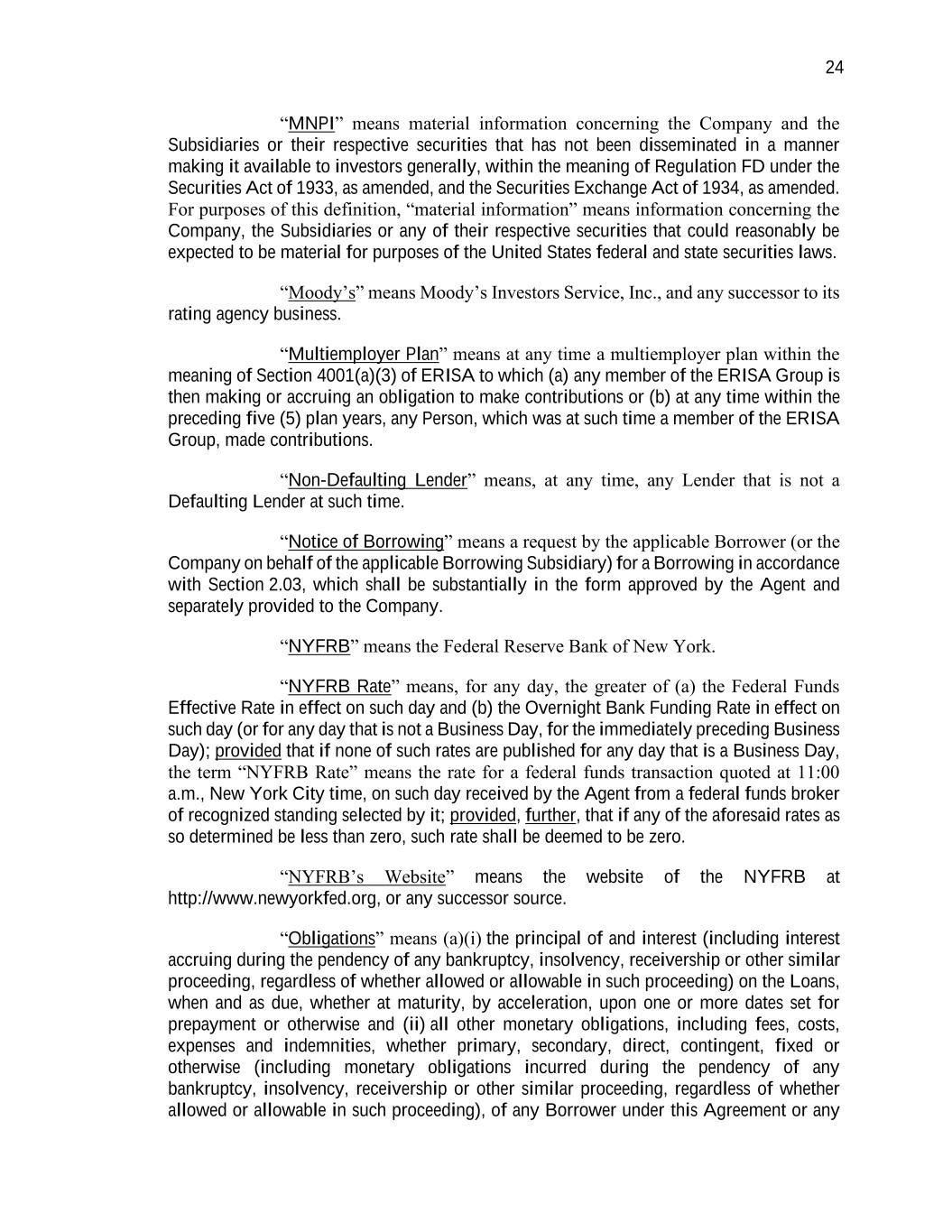 24 “MNPI” means material information concerning the Company and the Subsidiaries or their respective securities that has not been disseminated in a manner making it available to investors generally, within the meaning of Regulation FD under the Securities Act of 1933, as amended, and the Securities Exchange Act of 1934, as amended. For purposes of this definition, “material information” means information concerning the Company, the Subsidiaries or any of their respective securities that could reasonably be expected to be material for purposes of the United States federal and state securities laws. “Moody’s” means Moody’s Investors Service, Inc., and any successor to its rating agency business. “Multiemployer Plan” means at any time a multiemployer plan within the meaning of Section 4001(a)(3) of ERISA to which (a) any member of the ERISA Group is then making or accruing an obligation to make contributions or (b) at any time within the preceding five (5) plan years, any Person, which was at such time a member of the ERISA Group, made contributions. “Non-Defaulting Lender” means, at any time, any Lender that is not a Defaulting Lender at such time. “Notice of Borrowing” means a request by the applicable Borrower (or the Company on behalf of the applicable Borrowing Subsidiary) for a Borrowing in accordance with Section 2.03, which shall be substantially in the form approved by the Agent and separately provided to the Company. “NYFRB” means the Federal Reserve Bank of New York. “NYFRB Rate” means, for any day, the greater of (a) the Federal Funds Effective Rate in effect on such day and (b) the Overnight Bank Funding Rate in effect on such day (or for any day that is not a Business Day, for the immediately preceding Business Day); provided that if none of such rates are published for any day that is a Business Day, the term “NYFRB Rate” means the rate for a federal funds transaction quoted at 11:00 a.m., New York City time, on such day received by the Agent from a federal funds broker of recognized standing selected by it; provided, further, that if any of the aforesaid rates as so determined be less than zero, such rate shall be deemed to be zero. “NYFRB’s Website” means the website of the NYFRB at http://www.newyorkfed.org, or any successor source. “Obligations” means (a)(i) the principal of and interest (including interest accruing during the pendency of any bankruptcy, insolvency, receivership or other similar proceeding, regardless of whether allowed or allowable in such proceeding) on the Loans, when and as due, whether at maturity, by acceleration, upon one or more dates set for prepayment or otherwise and (ii) all other monetary obligations, including fees, costs, expenses and indemnities, whether primary, secondary, direct, contingent, fixed or otherwise (including monetary obligations incurred during the pendency of any bankruptcy, insolvency, receivership or other similar proceeding, regardless of whether allowed or allowable in such proceeding), of any Borrower under this Agreement or any