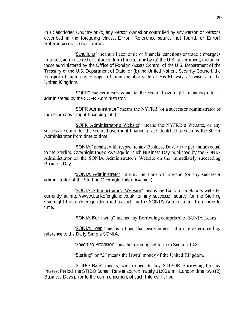 29 in a Sanctioned Country or (c) any Person owned or controlled by any Person or Persons described in the foregoing clauses Error! Reference source not found. or Error! Reference source not found.. “Sanctions” means all economic or financial sanctions or trade embargoes imposed, administered or enforced from time to time by (a) the U.S. government, including those administered by the Office of Foreign Assets Control of the U.S. Department of the Treasury or the U.S. Department of State, or (b) the United Nations Security Council, the European Union, any European Union member state or His Majesty’s Treasury of the United Kingdom. “SOFR” means a rate equal to the secured overnight financing rate as administered by the SOFR Administrator. “SOFR Administrator” means the NYFRB (or a successor administrator of the secured overnight financing rate). “SOFR Administrator’s Website” means the NYFRB’s Website, or any successor source for the secured overnight financing rate identified as such by the SOFR Administrator from time to time. “SONIA” means, with respect to any Business Day, a rate per annum equal to the Sterling Overnight Index Average for such Business Day published by the SONIA Administrator on the SONIA Administrator’s Website on the immediately succeeding Business Day. “SONIA Administrator” means the Bank of England (or any successor administrator of the Sterling Overnight Index Average). “SONIA Administrator’s Website” means the Bank of England’s website, currently at http://www.bankofengland.co.uk, or any successor source for the Sterling Overnight Index Average identified as such by the SONIA Administrator from time to time. “SONIA Borrowing” means any Borrowing comprised of SONIA Loans. “SONIA Loan” means a Loan that bears interest at a rate determined by reference to the Daily Simple SONIA. “Specified Provision” has the meaning set forth in Section 1.08. “Sterling” or “£” means the lawful money of the United Kingdom. “STIBO Rate” means, with respect to any STIBOR Borrowing for any Interest Period, the STIBO Screen Rate at approximately 11:00 a.m., London time, two (2) Business Days prior to the commencement of such Interest Period.