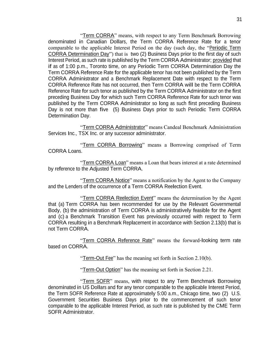 31 “Term CORRA” means, with respect to any Term Benchmark Borrowing denominated in Canadian Dollars, the Term CORRA Reference Rate for a tenor comparable to the applicable Interest Period on the day (such day, the “Periodic Term CORRA Determination Day”) that is two (2) Business Days prior to the first day of such Interest Period, as such rate is published by the Term CORRA Administrator; provided that if as of 1:00 p.m., Toronto time, on any Periodic Term CORRA Determination Day the Term CORRA Reference Rate for the applicable tenor has not been published by the Term CORRA Administrator and a Benchmark Replacement Date with respect to the Term CORRA Reference Rate has not occurred, then Term CORRA will be the Term CORRA Reference Rate for such tenor as published by the Term CORRA Administrator on the first preceding Business Day for which such Term CORRA Reference Rate for such tenor was published by the Term CORRA Administrator so long as such first preceding Business Day is not more than five (5) Business Days prior to such Periodic Term CORRA Determination Day. “Term CORRA Administrator” means Candeal Benchmark Administration Services Inc., TSX Inc. or any successor administrator. “Term CORRA Borrowing” means a Borrowing comprised of Term CORRA Loans. “Term CORRA Loan” means a Loan that bears interest at a rate determined by reference to the Adjusted Term CORRA. “Term CORRA Notice” means a notification by the Agent to the Company and the Lenders of the occurrence of a Term CORRA Reelection Event. “Term CORRA Reelection Event” means the determination by the Agent that (a) Term CORRA has been recommended for use by the Relevant Governmental Body, (b) the administration of Term CORRA is administratively feasible for the Agent and (c) a Benchmark Transition Event has previously occurred with respect to Term CORRA resulting in a Benchmark Replacement in accordance with Section 2.13(b) that is not Term CORRA. “Term CORRA Reference Rate” means the forward-looking term rate based on CORRA. “Term-Out Fee” has the meaning set forth in Section 2.10(b). “Term-Out Option” has the meaning set forth in Section 2.21. “Term SOFR” means, with respect to any Term Benchmark Borrowing denominated in US Dollars and for any tenor comparable to the applicable Interest Period, the Term SOFR Reference Rate at approximately 5:00 a.m., Chicago time, two (2) U.S. Government Securities Business Days prior to the commencement of such tenor comparable to the applicable Interest Period, as such rate is published by the CME Term SOFR Administrator.