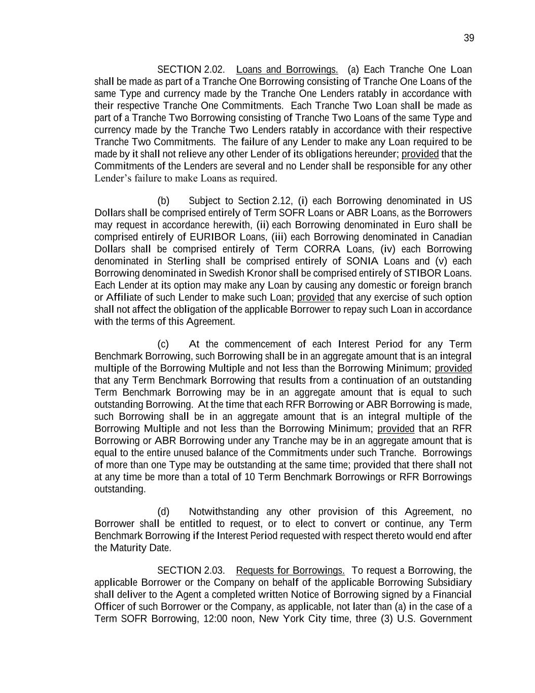 39 SECTION 2.02. Loans and Borrowings. (a) Each Tranche One Loan shall be made as part of a Tranche One Borrowing consisting of Tranche One Loans of the same Type and currency made by the Tranche One Lenders ratably in accordance with their respective Tranche One Commitments. Each Tranche Two Loan shall be made as part of a Tranche Two Borrowing consisting of Tranche Two Loans of the same Type and currency made by the Tranche Two Lenders ratably in accordance with their respective Tranche Two Commitments. The failure of any Lender to make any Loan required to be made by it shall not relieve any other Lender of its obligations hereunder; provided that the Commitments of the Lenders are several and no Lender shall be responsible for any other Lender’s failure to make Loans as required. (b) Subject to Section 2.12, (i) each Borrowing denominated in US Dollars shall be comprised entirely of Term SOFR Loans or ABR Loans, as the Borrowers may request in accordance herewith, (ii) each Borrowing denominated in Euro shall be comprised entirely of EURIBOR Loans, (iii) each Borrowing denominated in Canadian Dollars shall be comprised entirely of Term CORRA Loans, (iv) each Borrowing denominated in Sterling shall be comprised entirely of SONIA Loans and (v) each Borrowing denominated in Swedish Kronor shall be comprised entirely of STIBOR Loans. Each Lender at its option may make any Loan by causing any domestic or foreign branch or Affiliate of such Lender to make such Loan; provided that any exercise of such option shall not affect the obligation of the applicable Borrower to repay such Loan in accordance with the terms of this Agreement. (c) At the commencement of each Interest Period for any Term Benchmark Borrowing, such Borrowing shall be in an aggregate amount that is an integral multiple of the Borrowing Multiple and not less than the Borrowing Minimum; provided that any Term Benchmark Borrowing that results from a continuation of an outstanding Term Benchmark Borrowing may be in an aggregate amount that is equal to such outstanding Borrowing. At the time that each RFR Borrowing or ABR Borrowing is made, such Borrowing shall be in an aggregate amount that is an integral multiple of the Borrowing Multiple and not less than the Borrowing Minimum; provided that an RFR Borrowing or ABR Borrowing under any Tranche may be in an aggregate amount that is equal to the entire unused balance of the Commitments under such Tranche. Borrowings of more than one Type may be outstanding at the same time; provided that there shall not at any time be more than a total of 10 Term Benchmark Borrowings or RFR Borrowings outstanding. (d) Notwithstanding any other provision of this Agreement, no Borrower shall be entitled to request, or to elect to convert or continue, any Term Benchmark Borrowing if the Interest Period requested with respect thereto would end after the Maturity Date. SECTION 2.03. Requests for Borrowings. To request a Borrowing, the applicable Borrower or the Company on behalf of the applicable Borrowing Subsidiary shall deliver to the Agent a completed written Notice of Borrowing signed by a Financial Officer of such Borrower or the Company, as applicable, not later than (a) in the case of a Term SOFR Borrowing, 12:00 noon, New York City time, three (3) U.S. Government
