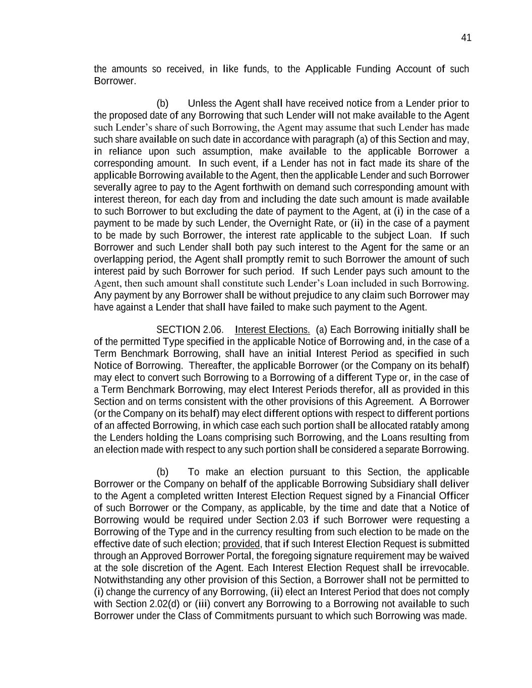 41 the amounts so received, in like funds, to the Applicable Funding Account of such Borrower. (b) Unless the Agent shall have received notice from a Lender prior to the proposed date of any Borrowing that such Lender will not make available to the Agent such Lender’s share of such Borrowing, the Agent may assume that such Lender has made such share available on such date in accordance with paragraph (a) of this Section and may, in reliance upon such assumption, make available to the applicable Borrower a corresponding amount. In such event, if a Lender has not in fact made its share of the applicable Borrowing available to the Agent, then the applicable Lender and such Borrower severally agree to pay to the Agent forthwith on demand such corresponding amount with interest thereon, for each day from and including the date such amount is made available to such Borrower to but excluding the date of payment to the Agent, at (i) in the case of a payment to be made by such Lender, the Overnight Rate, or (ii) in the case of a payment to be made by such Borrower, the interest rate applicable to the subject Loan. If such Borrower and such Lender shall both pay such interest to the Agent for the same or an overlapping period, the Agent shall promptly remit to such Borrower the amount of such interest paid by such Borrower for such period. If such Lender pays such amount to the Agent, then such amount shall constitute such Lender’s Loan included in such Borrowing. Any payment by any Borrower shall be without prejudice to any claim such Borrower may have against a Lender that shall have failed to make such payment to the Agent. SECTION 2.06. Interest Elections. (a) Each Borrowing initially shall be of the permitted Type specified in the applicable Notice of Borrowing and, in the case of a Term Benchmark Borrowing, shall have an initial Interest Period as specified in such Notice of Borrowing. Thereafter, the applicable Borrower (or the Company on its behalf) may elect to convert such Borrowing to a Borrowing of a different Type or, in the case of a Term Benchmark Borrowing, may elect Interest Periods therefor, all as provided in this Section and on terms consistent with the other provisions of this Agreement. A Borrower (or the Company on its behalf) may elect different options with respect to different portions of an affected Borrowing, in which case each such portion shall be allocated ratably among the Lenders holding the Loans comprising such Borrowing, and the Loans resulting from an election made with respect to any such portion shall be considered a separate Borrowing. (b) To make an election pursuant to this Section, the applicable Borrower or the Company on behalf of the applicable Borrowing Subsidiary shall deliver to the Agent a completed written Interest Election Request signed by a Financial Officer of such Borrower or the Company, as applicable, by the time and date that a Notice of Borrowing would be required under Section 2.03 if such Borrower were requesting a Borrowing of the Type and in the currency resulting from such election to be made on the effective date of such election; provided, that if such Interest Election Request is submitted through an Approved Borrower Portal, the foregoing signature requirement may be waived at the sole discretion of the Agent. Each Interest Election Request shall be irrevocable. Notwithstanding any other provision of this Section, a Borrower shall not be permitted to (i) change the currency of any Borrowing, (ii) elect an Interest Period that does not comply with Section 2.02(d) or (iii) convert any Borrowing to a Borrowing not available to such Borrower under the Class of Commitments pursuant to which such Borrowing was made.