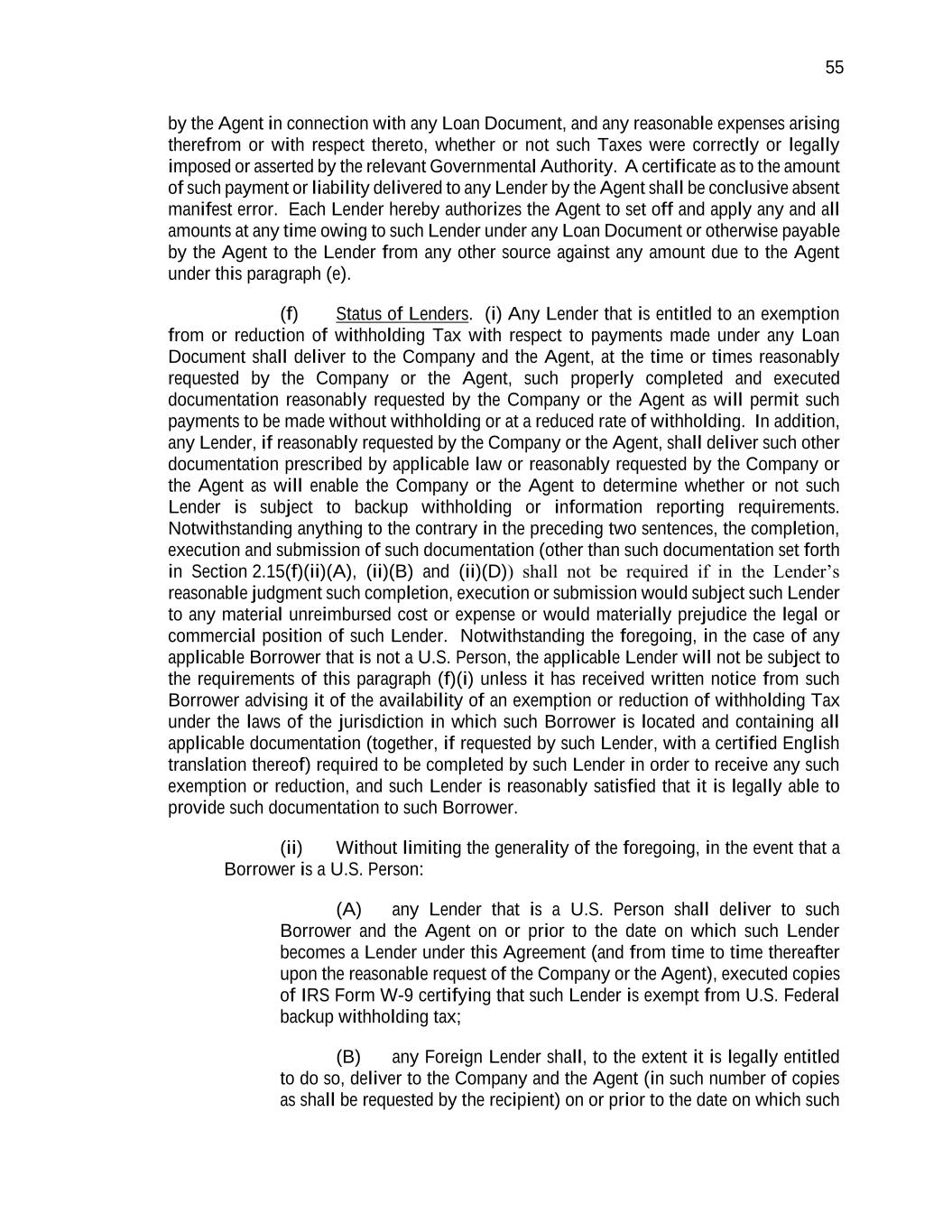 55 by the Agent in connection with any Loan Document, and any reasonable expenses arising therefrom or with respect thereto, whether or not such Taxes were correctly or legally imposed or asserted by the relevant Governmental Authority. A certificate as to the amount of such payment or liability delivered to any Lender by the Agent shall be conclusive absent manifest error. Each Lender hereby authorizes the Agent to set off and apply any and all amounts at any time owing to such Lender under any Loan Document or otherwise payable by the Agent to the Lender from any other source against any amount due to the Agent under this paragraph (e). (f) Status of Lenders. (i) Any Lender that is entitled to an exemption from or reduction of withholding Tax with respect to payments made under any Loan Document shall deliver to the Company and the Agent, at the time or times reasonably requested by the Company or the Agent, such properly completed and executed documentation reasonably requested by the Company or the Agent as will permit such payments to be made without withholding or at a reduced rate of withholding. In addition, any Lender, if reasonably requested by the Company or the Agent, shall deliver such other documentation prescribed by applicable law or reasonably requested by the Company or the Agent as will enable the Company or the Agent to determine whether or not such Lender is subject to backup withholding or information reporting requirements. Notwithstanding anything to the contrary in the preceding two sentences, the completion, execution and submission of such documentation (other than such documentation set forth in Section 2.15(f)(ii)(A), (ii)(B) and (ii)(D)) shall not be required if in the Lender’s reasonable judgment such completion, execution or submission would subject such Lender to any material unreimbursed cost or expense or would materially prejudice the legal or commercial position of such Lender. Notwithstanding the foregoing, in the case of any applicable Borrower that is not a U.S. Person, the applicable Lender will not be subject to the requirements of this paragraph (f)(i) unless it has received written notice from such Borrower advising it of the availability of an exemption or reduction of withholding Tax under the laws of the jurisdiction in which such Borrower is located and containing all applicable documentation (together, if requested by such Lender, with a certified English translation thereof) required to be completed by such Lender in order to receive any such exemption or reduction, and such Lender is reasonably satisfied that it is legally able to provide such documentation to such Borrower. (ii) Without limiting the generality of the foregoing, in the event that a Borrower is a U.S. Person: (A) any Lender that is a U.S. Person shall deliver to such Borrower and the Agent on or prior to the date on which such Lender becomes a Lender under this Agreement (and from time to time thereafter upon the reasonable request of the Company or the Agent), executed copies of IRS Form W-9 certifying that such Lender is exempt from U.S. Federal backup withholding tax; (B) any Foreign Lender shall, to the extent it is legally entitled to do so, deliver to the Company and the Agent (in such number of copies as shall be requested by the recipient) on or prior to the date on which such