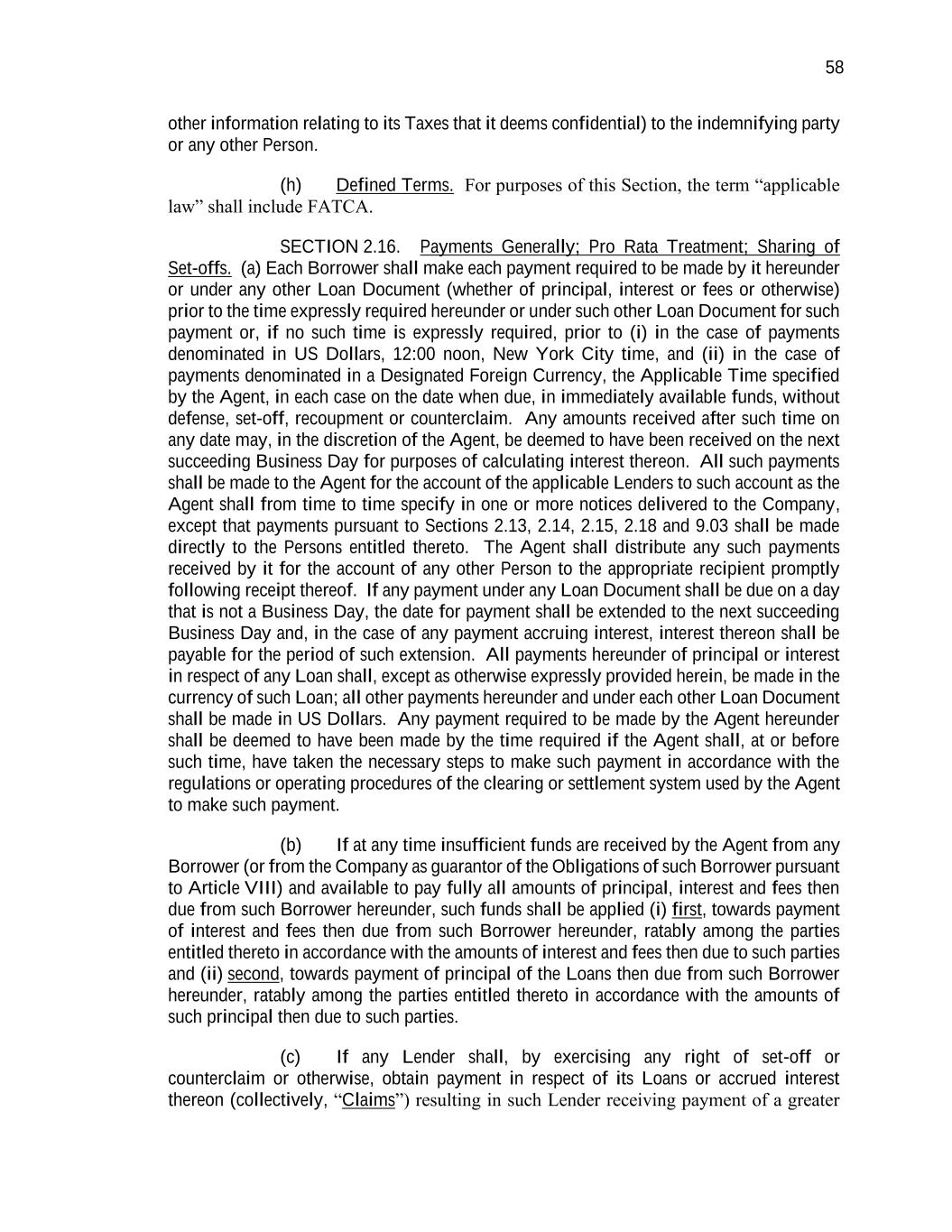 58 other information relating to its Taxes that it deems confidential) to the indemnifying party or any other Person. (h) Defined Terms. For purposes of this Section, the term “applicable law” shall include FATCA. SECTION 2.16. Payments Generally; Pro Rata Treatment; Sharing of Set-offs. (a) Each Borrower shall make each payment required to be made by it hereunder or under any other Loan Document (whether of principal, interest or fees or otherwise) prior to the time expressly required hereunder or under such other Loan Document for such payment or, if no such time is expressly required, prior to (i) in the case of payments denominated in US Dollars, 12:00 noon, New York City time, and (ii) in the case of payments denominated in a Designated Foreign Currency, the Applicable Time specified by the Agent, in each case on the date when due, in immediately available funds, without defense, set-off, recoupment or counterclaim. Any amounts received after such time on any date may, in the discretion of the Agent, be deemed to have been received on the next succeeding Business Day for purposes of calculating interest thereon. All such payments shall be made to the Agent for the account of the applicable Lenders to such account as the Agent shall from time to time specify in one or more notices delivered to the Company, except that payments pursuant to Sections 2.13, 2.14, 2.15, 2.18 and 9.03 shall be made directly to the Persons entitled thereto. The Agent shall distribute any such payments received by it for the account of any other Person to the appropriate recipient promptly following receipt thereof. If any payment under any Loan Document shall be due on a day that is not a Business Day, the date for payment shall be extended to the next succeeding Business Day and, in the case of any payment accruing interest, interest thereon shall be payable for the period of such extension. All payments hereunder of principal or interest in respect of any Loan shall, except as otherwise expressly provided herein, be made in the currency of such Loan; all other payments hereunder and under each other Loan Document shall be made in US Dollars. Any payment required to be made by the Agent hereunder shall be deemed to have been made by the time required if the Agent shall, at or before such time, have taken the necessary steps to make such payment in accordance with the regulations or operating procedures of the clearing or settlement system used by the Agent to make such payment. (b) If at any time insufficient funds are received by the Agent from any Borrower (or from the Company as guarantor of the Obligations of such Borrower pursuant to Article VIII) and available to pay fully all amounts of principal, interest and fees then due from such Borrower hereunder, such funds shall be applied (i) first, towards payment of interest and fees then due from such Borrower hereunder, ratably among the parties entitled thereto in accordance with the amounts of interest and fees then due to such parties and (ii) second, towards payment of principal of the Loans then due from such Borrower hereunder, ratably among the parties entitled thereto in accordance with the amounts of such principal then due to such parties. (c) If any Lender shall, by exercising any right of set-off or counterclaim or otherwise, obtain payment in respect of its Loans or accrued interest thereon (collectively, “Claims”) resulting in such Lender receiving payment of a greater