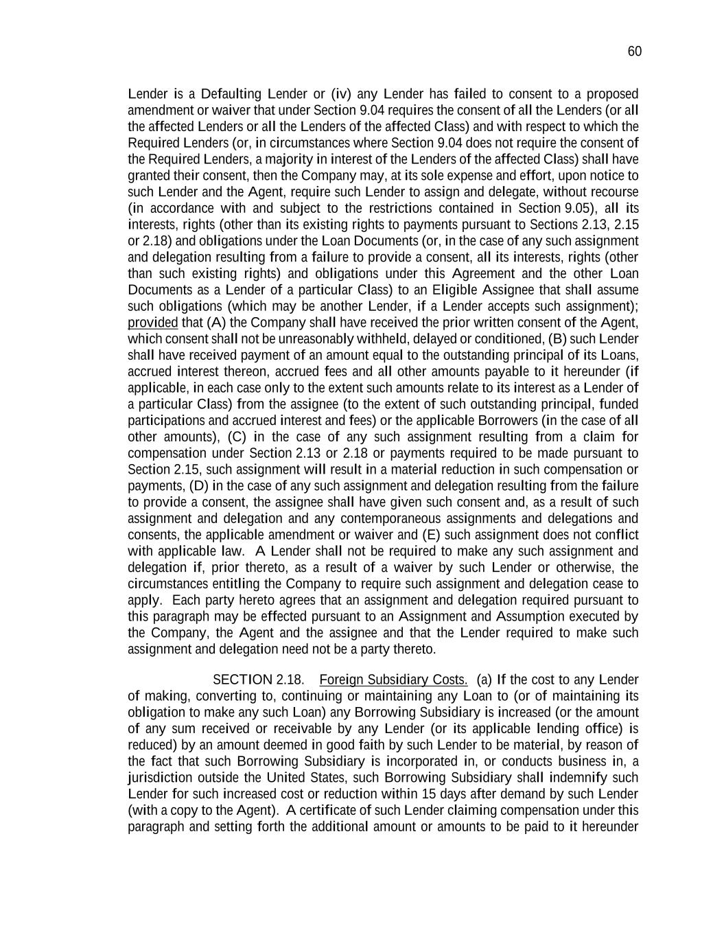 60 Lender is a Defaulting Lender or (iv) any Lender has failed to consent to a proposed amendment or waiver that under Section 9.04 requires the consent of all the Lenders (or all the affected Lenders or all the Lenders of the affected Class) and with respect to which the Required Lenders (or, in circumstances where Section 9.04 does not require the consent of the Required Lenders, a majority in interest of the Lenders of the affected Class) shall have granted their consent, then the Company may, at its sole expense and effort, upon notice to such Lender and the Agent, require such Lender to assign and delegate, without recourse (in accordance with and subject to the restrictions contained in Section 9.05), all its interests, rights (other than its existing rights to payments pursuant to Sections 2.13, 2.15 or 2.18) and obligations under the Loan Documents (or, in the case of any such assignment and delegation resulting from a failure to provide a consent, all its interests, rights (other than such existing rights) and obligations under this Agreement and the other Loan Documents as a Lender of a particular Class) to an Eligible Assignee that shall assume such obligations (which may be another Lender, if a Lender accepts such assignment); provided that (A) the Company shall have received the prior written consent of the Agent, which consent shall not be unreasonably withheld, delayed or conditioned, (B) such Lender shall have received payment of an amount equal to the outstanding principal of its Loans, accrued interest thereon, accrued fees and all other amounts payable to it hereunder (if applicable, in each case only to the extent such amounts relate to its interest as a Lender of a particular Class) from the assignee (to the extent of such outstanding principal, funded participations and accrued interest and fees) or the applicable Borrowers (in the case of all other amounts), (C) in the case of any such assignment resulting from a claim for compensation under Section 2.13 or 2.18 or payments required to be made pursuant to Section 2.15, such assignment will result in a material reduction in such compensation or payments, (D) in the case of any such assignment and delegation resulting from the failure to provide a consent, the assignee shall have given such consent and, as a result of such assignment and delegation and any contemporaneous assignments and delegations and consents, the applicable amendment or waiver and (E) such assignment does not conflict with applicable law. A Lender shall not be required to make any such assignment and delegation if, prior thereto, as a result of a waiver by such Lender or otherwise, the circumstances entitling the Company to require such assignment and delegation cease to apply. Each party hereto agrees that an assignment and delegation required pursuant to this paragraph may be effected pursuant to an Assignment and Assumption executed by the Company, the Agent and the assignee and that the Lender required to make such assignment and delegation need not be a party thereto. SECTION 2.18. Foreign Subsidiary Costs. (a) If the cost to any Lender of making, converting to, continuing or maintaining any Loan to (or of maintaining its obligation to make any such Loan) any Borrowing Subsidiary is increased (or the amount of any sum received or receivable by any Lender (or its applicable lending office) is reduced) by an amount deemed in good faith by such Lender to be material, by reason of the fact that such Borrowing Subsidiary is incorporated in, or conducts business in, a jurisdiction outside the United States, such Borrowing Subsidiary shall indemnify such Lender for such increased cost or reduction within 15 days after demand by such Lender (with a copy to the Agent). A certificate of such Lender claiming compensation under this paragraph and setting forth the additional amount or amounts to be paid to it hereunder