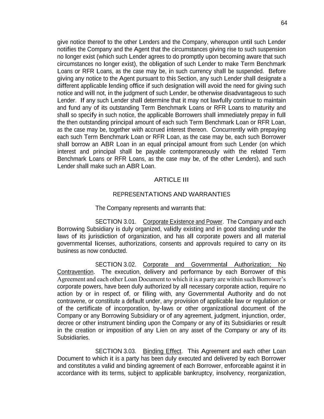 64 give notice thereof to the other Lenders and the Company, whereupon until such Lender notifies the Company and the Agent that the circumstances giving rise to such suspension no longer exist (which such Lender agrees to do promptly upon becoming aware that such circumstances no longer exist), the obligation of such Lender to make Term Benchmark Loans or RFR Loans, as the case may be, in such currency shall be suspended. Before giving any notice to the Agent pursuant to this Section, any such Lender shall designate a different applicable lending office if such designation will avoid the need for giving such notice and will not, in the judgment of such Lender, be otherwise disadvantageous to such Lender. If any such Lender shall determine that it may not lawfully continue to maintain and fund any of its outstanding Term Benchmark Loans or RFR Loans to maturity and shall so specify in such notice, the applicable Borrowers shall immediately prepay in full the then outstanding principal amount of each such Term Benchmark Loan or RFR Loan, as the case may be, together with accrued interest thereon. Concurrently with prepaying each such Term Benchmark Loan or RFR Loan, as the case may be, each such Borrower shall borrow an ABR Loan in an equal principal amount from such Lender (on which interest and principal shall be payable contemporaneously with the related Term Benchmark Loans or RFR Loans, as the case may be, of the other Lenders), and such Lender shall make such an ABR Loan. ARTICLE III REPRESENTATIONS AND WARRANTIES The Company represents and warrants that: SECTION 3.01. Corporate Existence and Power. The Company and each Borrowing Subsidiary is duly organized, validly existing and in good standing under the laws of its jurisdiction of organization, and has all corporate powers and all material governmental licenses, authorizations, consents and approvals required to carry on its business as now conducted. SECTION 3.02. Corporate and Governmental Authorization; No Contravention. The execution, delivery and performance by each Borrower of this Agreement and each other Loan Document to which it is a party are within such Borrower’s corporate powers, have been duly authorized by all necessary corporate action, require no action by or in respect of, or filing with, any Governmental Authority and do not contravene, or constitute a default under, any provision of applicable law or regulation or of the certificate of incorporation, by-laws or other organizational document of the Company or any Borrowing Subsidiary or of any agreement, judgment, injunction, order, decree or other instrument binding upon the Company or any of its Subsidiaries or result in the creation or imposition of any Lien on any asset of the Company or any of its Subsidiaries. SECTION 3.03. Binding Effect. This Agreement and each other Loan Document to which it is a party has been duly executed and delivered by each Borrower and constitutes a valid and binding agreement of each Borrower, enforceable against it in accordance with its terms, subject to applicable bankruptcy, insolvency, reorganization,