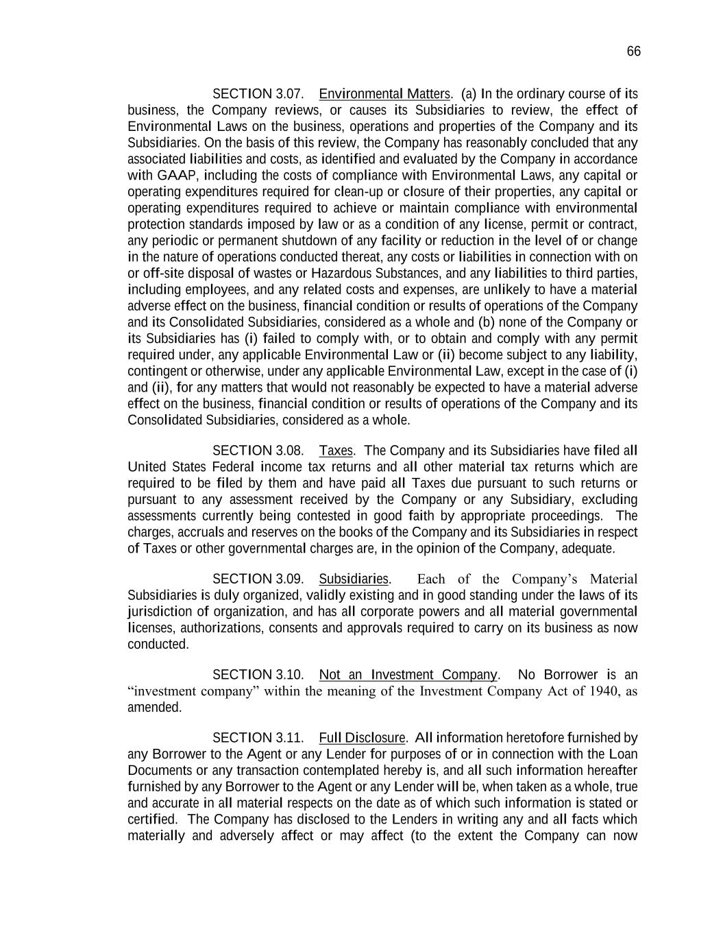 66 SECTION 3.07. Environmental Matters. (a) In the ordinary course of its business, the Company reviews, or causes its Subsidiaries to review, the effect of Environmental Laws on the business, operations and properties of the Company and its Subsidiaries. On the basis of this review, the Company has reasonably concluded that any associated liabilities and costs, as identified and evaluated by the Company in accordance with GAAP, including the costs of compliance with Environmental Laws, any capital or operating expenditures required for clean-up or closure of their properties, any capital or operating expenditures required to achieve or maintain compliance with environmental protection standards imposed by law or as a condition of any license, permit or contract, any periodic or permanent shutdown of any facility or reduction in the level of or change in the nature of operations conducted thereat, any costs or liabilities in connection with on or off-site disposal of wastes or Hazardous Substances, and any liabilities to third parties, including employees, and any related costs and expenses, are unlikely to have a material adverse effect on the business, financial condition or results of operations of the Company and its Consolidated Subsidiaries, considered as a whole and (b) none of the Company or its Subsidiaries has (i) failed to comply with, or to obtain and comply with any permit required under, any applicable Environmental Law or (ii) become subject to any liability, contingent or otherwise, under any applicable Environmental Law, except in the case of (i) and (ii), for any matters that would not reasonably be expected to have a material adverse effect on the business, financial condition or results of operations of the Company and its Consolidated Subsidiaries, considered as a whole. SECTION 3.08. Taxes. The Company and its Subsidiaries have filed all United States Federal income tax returns and all other material tax returns which are required to be filed by them and have paid all Taxes due pursuant to such returns or pursuant to any assessment received by the Company or any Subsidiary, excluding assessments currently being contested in good faith by appropriate proceedings. The charges, accruals and reserves on the books of the Company and its Subsidiaries in respect of Taxes or other governmental charges are, in the opinion of the Company, adequate. SECTION 3.09. Subsidiaries. Each of the Company’s Material Subsidiaries is duly organized, validly existing and in good standing under the laws of its jurisdiction of organization, and has all corporate powers and all material governmental licenses, authorizations, consents and approvals required to carry on its business as now conducted. SECTION 3.10. Not an Investment Company. No Borrower is an “investment company” within the meaning of the Investment Company Act of 1940, as amended. SECTION 3.11. Full Disclosure. All information heretofore furnished by any Borrower to the Agent or any Lender for purposes of or in connection with the Loan Documents or any transaction contemplated hereby is, and all such information hereafter furnished by any Borrower to the Agent or any Lender will be, when taken as a whole, true and accurate in all material respects on the date as of which such information is stated or certified. The Company has disclosed to the Lenders in writing any and all facts which materially and adversely affect or may affect (to the extent the Company can now
