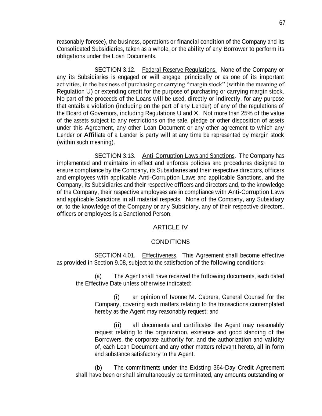 67 reasonably foresee), the business, operations or financial condition of the Company and its Consolidated Subsidiaries, taken as a whole, or the ability of any Borrower to perform its obligations under the Loan Documents. SECTION 3.12. Federal Reserve Regulations. None of the Company or any its Subsidiaries is engaged or will engage, principally or as one of its important activities, in the business of purchasing or carrying “margin stock” (within the meaning of Regulation U) or extending credit for the purpose of purchasing or carrying margin stock. No part of the proceeds of the Loans will be used, directly or indirectly, for any purpose that entails a violation (including on the part of any Lender) of any of the regulations of the Board of Governors, including Regulations U and X. Not more than 25% of the value of the assets subject to any restrictions on the sale, pledge or other disposition of assets under this Agreement, any other Loan Document or any other agreement to which any Lender or Affiliate of a Lender is party will at any time be represented by margin stock (within such meaning). SECTION 3.13. Anti-Corruption Laws and Sanctions. The Company has implemented and maintains in effect and enforces policies and procedures designed to ensure compliance by the Company, its Subsidiaries and their respective directors, officers and employees with applicable Anti-Corruption Laws and applicable Sanctions, and the Company, its Subsidiaries and their respective officers and directors and, to the knowledge of the Company, their respective employees are in compliance with Anti-Corruption Laws and applicable Sanctions in all material respects. None of the Company, any Subsidiary or, to the knowledge of the Company or any Subsidiary, any of their respective directors, officers or employees is a Sanctioned Person. ARTICLE IV CONDITIONS SECTION 4.01. Effectiveness. This Agreement shall become effective as provided in Section 9.08, subject to the satisfaction of the following conditions: (a) The Agent shall have received the following documents, each dated the Effective Date unless otherwise indicated: (i) an opinion of Ivonne M. Cabrera, General Counsel for the Company, covering such matters relating to the transactions contemplated hereby as the Agent may reasonably request; and (ii) all documents and certificates the Agent may reasonably request relating to the organization, existence and good standing of the Borrowers, the corporate authority for, and the authorization and validity of, each Loan Document and any other matters relevant hereto, all in form and substance satisfactory to the Agent. (b) The commitments under the Existing 364-Day Credit Agreement shall have been or shall simultaneously be terminated, any amounts outstanding or